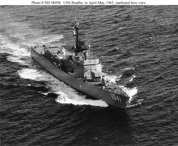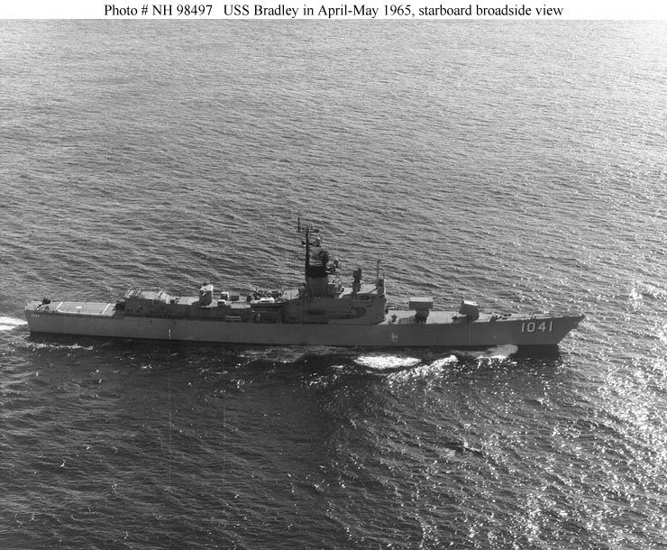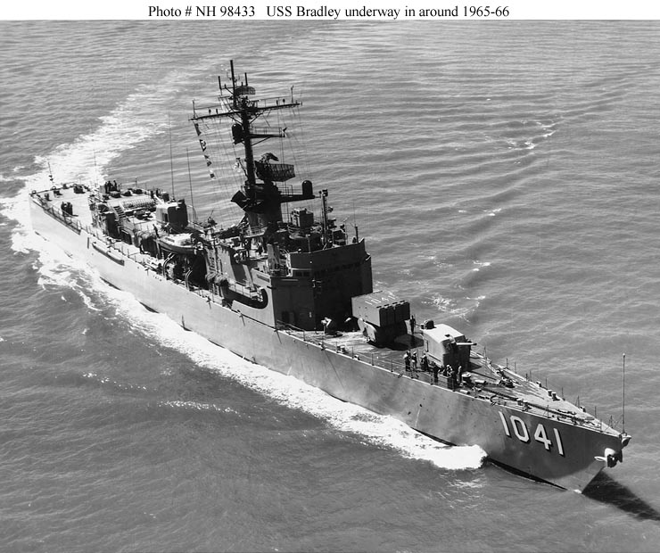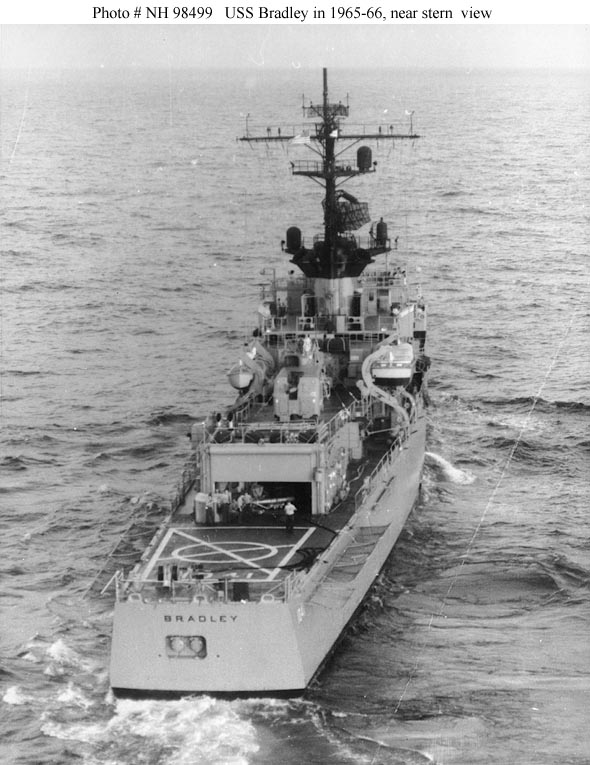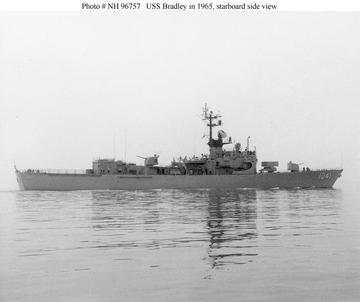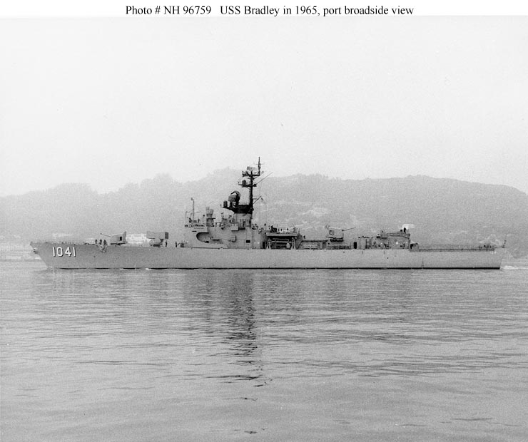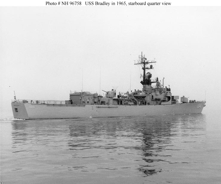USS Bradley, the second of ten 2,620-ton Garcia class escort ships, was built at San Francisco, California, and commissioned in May 1965. Her first deployment to the Westen Pacific between July and December 1966 included four months of gunfire support along the coast of South Vietnam and carrier escort duty in the Gulf of Tonkin. In February 1967 Bradley received the prototype destroyer installation of the Sea Sparrow Basic Point Defense Missile System (BPDMS). After intensive trials between May and September, the system was removed in September.