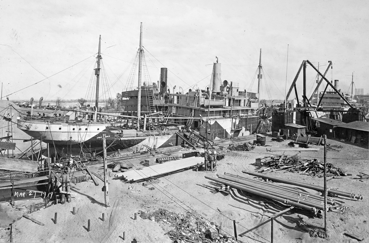 Notes: In 1916 Edward Terry of New York started construction of a new shipyard at Savannah, Georgia. In May 1917 he got a contract from the EFC for twenty composite cargo ships to a version of Merrill-Stevens's Design 1009 which the EFC designated Design 1010. In July 1917 the Mobile Shipbuilding Co. at Mobile, Ala., got a contract to build eighteen more ships to Terry's design, of which 12 were changed to larger steel cargo ships of Design 1038 in June 1918. In March 1918 Terry received an additional contract for ten tankers to a version of Bethlehem Steel Co.'s Design 1031. Ultimately Mobile completed all six of their composite ships, but Terry completed only six of their twenty plus five steel tankers, with four more cargo ships being delivered incomplete. Specifications: Design 1010 (McClelland/Terry, Mobile). Composite hull (steel frame). Deadweight tons: 3500 designed, 3575 actual. Dimensions: 284.5' oa, 270.0' pp x 46.0' ext (45.7' for Terry ships), 45.0' mld x 24.25' depth mld, 21.25' draft load. Propulsion: 1 screw, 1 triple expansion engine, 2 Baden watertube boilers, 1350 or 1400 IHP, 10 knots. Configuration: 1 deck, 2 holds, 4 hatches. |