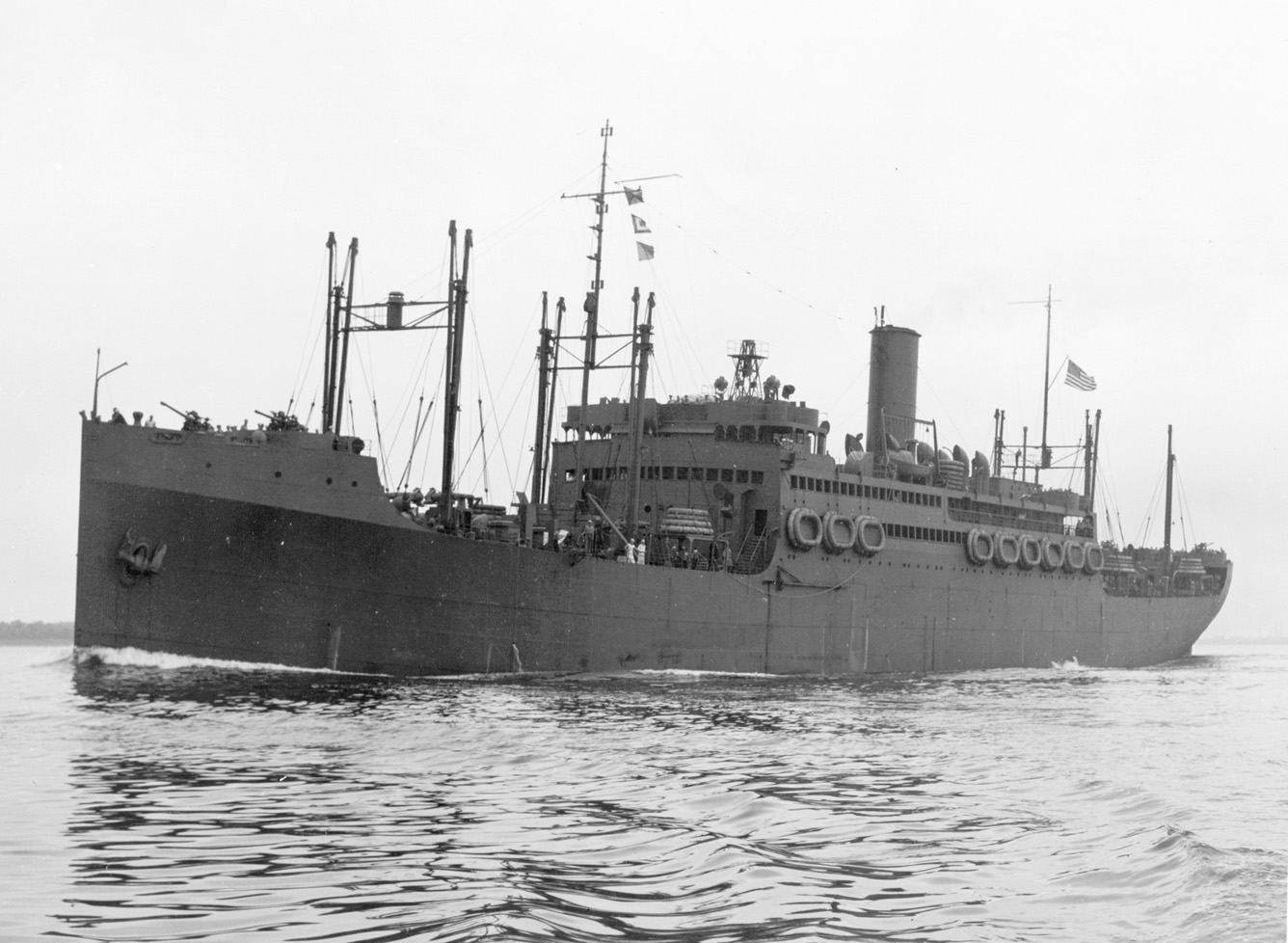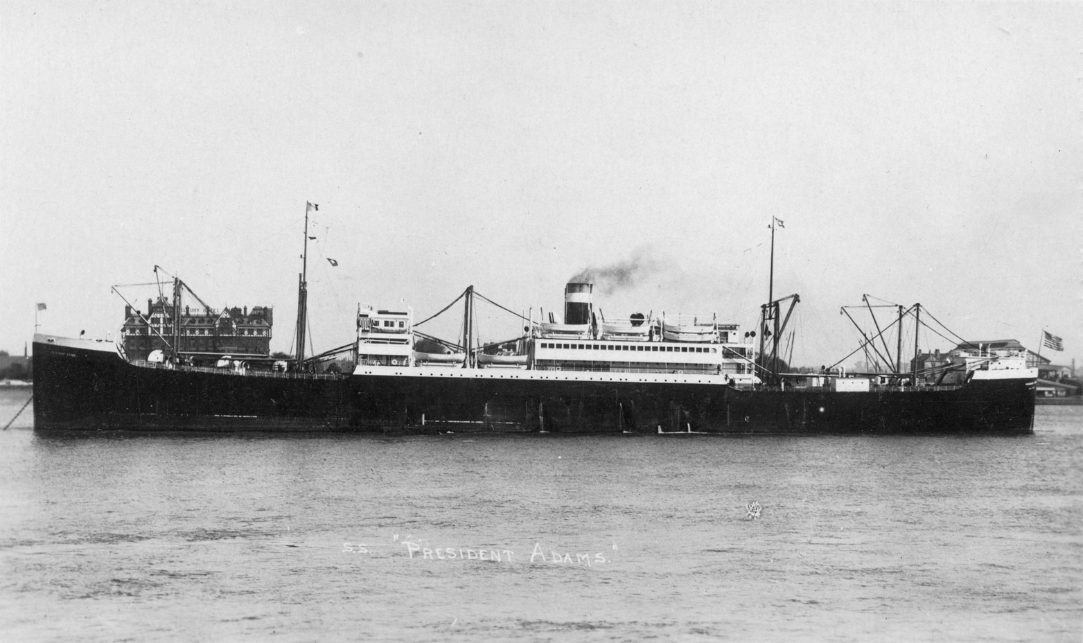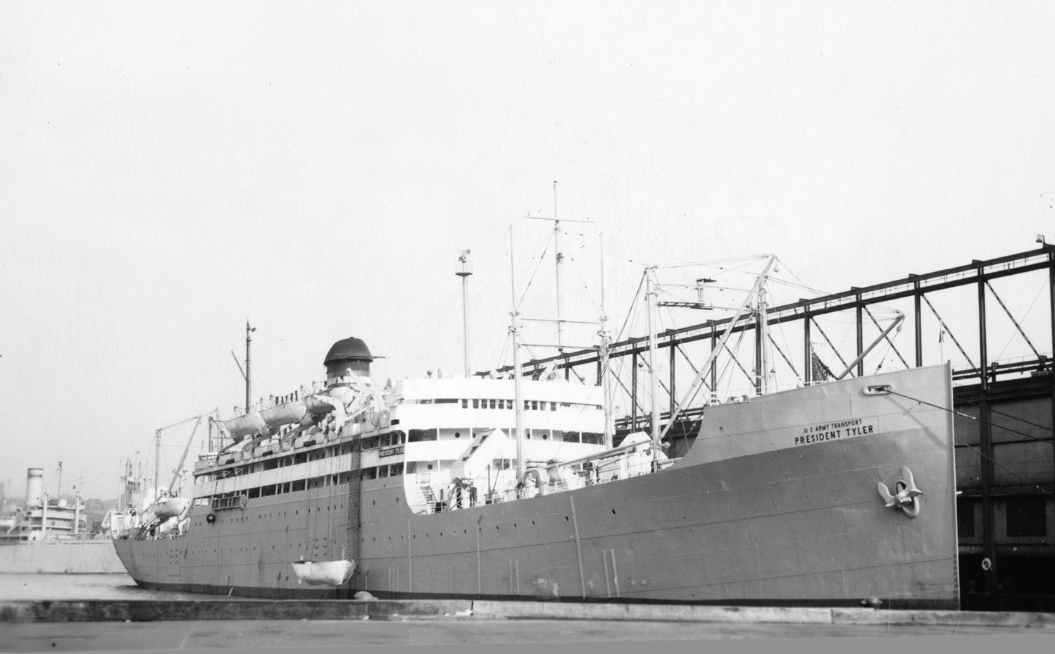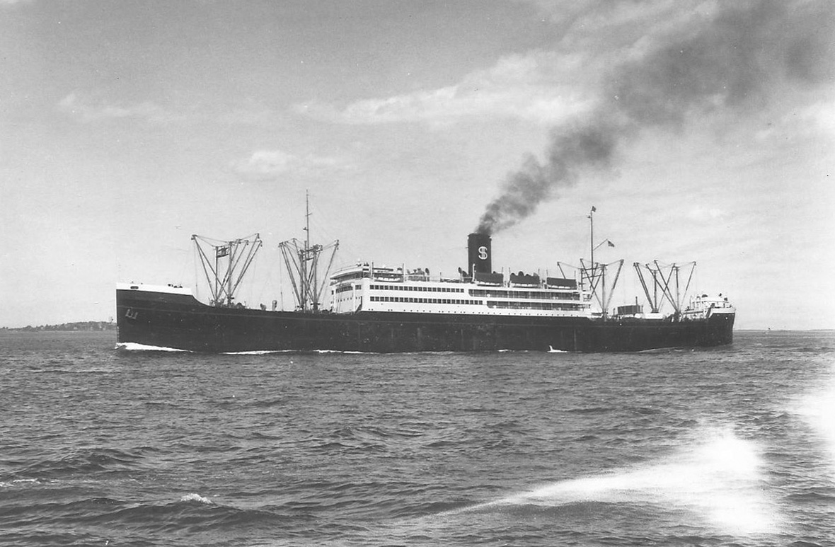 Notes: The first wartime announcement by the Shipping Board and the military on the troopships to be built by the EFC was that they would be limited to two specific designs: a big, fast 13,000 tonner able to carry 3,500 troops at 18 knots and an 8,500 tonner that could carry about 2,300 men at 15 knots. The smaller one became the Design 1024 Hog Island Type B (q.v.), the larger became the 535-foot long Design 1029. The first five Design 1029 ships were ordered in December 1917 beginning with three from the New York Shipbuilding Co. in Camden, N.J. As related at greater length on the Design 1029 page, the German all-out spring offensive begun at Cambrai on 21 March 1918 caused President Wilson to direct the Shipping Board to "go the limit" in its ship construction effort. On 1 July 1918 New York Ship received Contract 418 SC for seven more troopships (EFC Hulls 2585-2591). It probably planned to build these in its new "Middle Yard", which consisted of two twin 600-foot ways (4 slips) that had begun producing ships in December 1917. The ships of Contract 418 SC, however, were not built to Design 1029 (the "535") but to a new Design 1095 (the "502"). (Oddly the 535 foot measurement was length overall while the 502 was between perpendiculars.) New York Ship returned to Design 1029 in contracts of August 1918 for six more troopships, four to be built in a planned "South Yard" that was specifically designed to build "535"s and two in its original "North Yard". The circumstances that resulted in the development of the new 502-foot design are not totally clear. Its design number, Design 1095 can be dated to between June and August 1918 based on the dates of designs with lower and higher numbers. In its final form Contract 418 SC of 1 July 1918 (perhaps as signed a few weeks later) was an order for seven 502 foot long steel passenger/troop ships of 15,500 tons displacement and 6,000 hp. It may have been in mid-1918 that the Shipping Board and New York Ship asked the shipyard's chief naval archictect, E. H. Rigg, to develop a version of the "535" that would be less expensive to build. Thanks to a reduction in the speed requirement from 17 to 14 knots, which allowed elimination of half of the propulsion plant, and a reduction in the number of troops to be carried from 3,500 to 2,700, Rigg and his colleagues could probably have scaled down the "535" to produce the "502." It was still a troopship, and this is probably the design of a "Twin-Screw Troopship of 13,000 Tons D.W." that was published in considerable detail in International Marine Engineering in April 1919 with comments that it could easily be converted to a combined passenger and cargo steamer for commercial service. Based on this article, the Design 1095 troopship was a three-deck vessel (A, B, and C Decks) with two 'tween decks and three hull islands (a short poop and forecastle and a long bridge) designed to carry a total deadweight of 13,000 tons on a mean full load draft of 31'9" and a corresponding displacement of 20,900 tons. As troopships they had accommodations for about 2,700 troops (including 200 naval crew) and their deadweight capacity on trials was limited to 7,000 tons. The designed speed was 14 knots (14.5 on trials at 24' draft) with 7,000 indicated horsepower, but reserve power was provided with the intention of giving the ship while in the war zone and lightened in draft the necessary power to reach 15 knots. The principal hull dimensions were 522.5' length overall, 502' length per classification rules (between perpendiculars), 62' beam molded, and 42' depth from keel to A deck (the top continuous deck). There were six cargo holds forward of the single engine and boiler rooms and four aft of them. The troops completely occupied the two 'tween decks, with the navy crew at the after end of the upper 'tween deck. Accommodations for 103 troop officers in 4-berth cabins filled the long bridge island on the A deck and 2-berth cabins for 43 more senior naval and troop officers filled the single level of superstructure on the bridge deck above it, which was split by the hatches to No. 5 and 6 holds and their derrick posts. Forward of the split a second deckhouse on the boat deck level carried the ship's wheel house, chart room, and captain's and executive officer's quarters. Propulsion was by two sets of four-cylinder triple-expansion reciprocating engines with cylinders of 24", 40.5", 54", and 54" and a 45" stroke driving two propellers and supplied with steam at 220 psi by six single-end Scotch boilers. The armament was four 6-inch rapid fire guns. As of October 1918 the troopship program included 19 "535"s and 7 "502"s, which by now clearly exceeded any conceivable postwar military requirement. The "502" emerged from an initial round of plan revisions in December 1918-January 1919 as essentially a big cargo vessel with a maximum of 12 passengers to prevent it coming under passenger ship requirements for bulkhead subdivision. The Shipping Board leadership on 8 March 1919 reviewed plans for the conversion of all three types of transports (including the Hog Island B type) and asked Rigg for new plans. The cargo and living spaces were redesigned on orders of the shipping board's experienced Director of Operations, J.H. Rosseter, who drew some of the plans himself. The big 4-berth officer cabins on the A deck (or Saloon Deck) easily became 22 large two passenger cabins, the 2-berth cabins on the main part of the bridge deck (soon called the Promenade Deck) became ten two-person cabins, and a new Promenade Deck (or Upper Promenade Deck) was added on the old boat deck level above them with ten more two-person cabins, for a total in this version of 84 passengers, all first class. The boats were moved to the top of the new promenade deck, which was carried out to the sides of the vessel, glass enclosed, and was made of unsheathed steel. (The lower promenade deck was open.) The drawings at the top of this page essentially represent thi