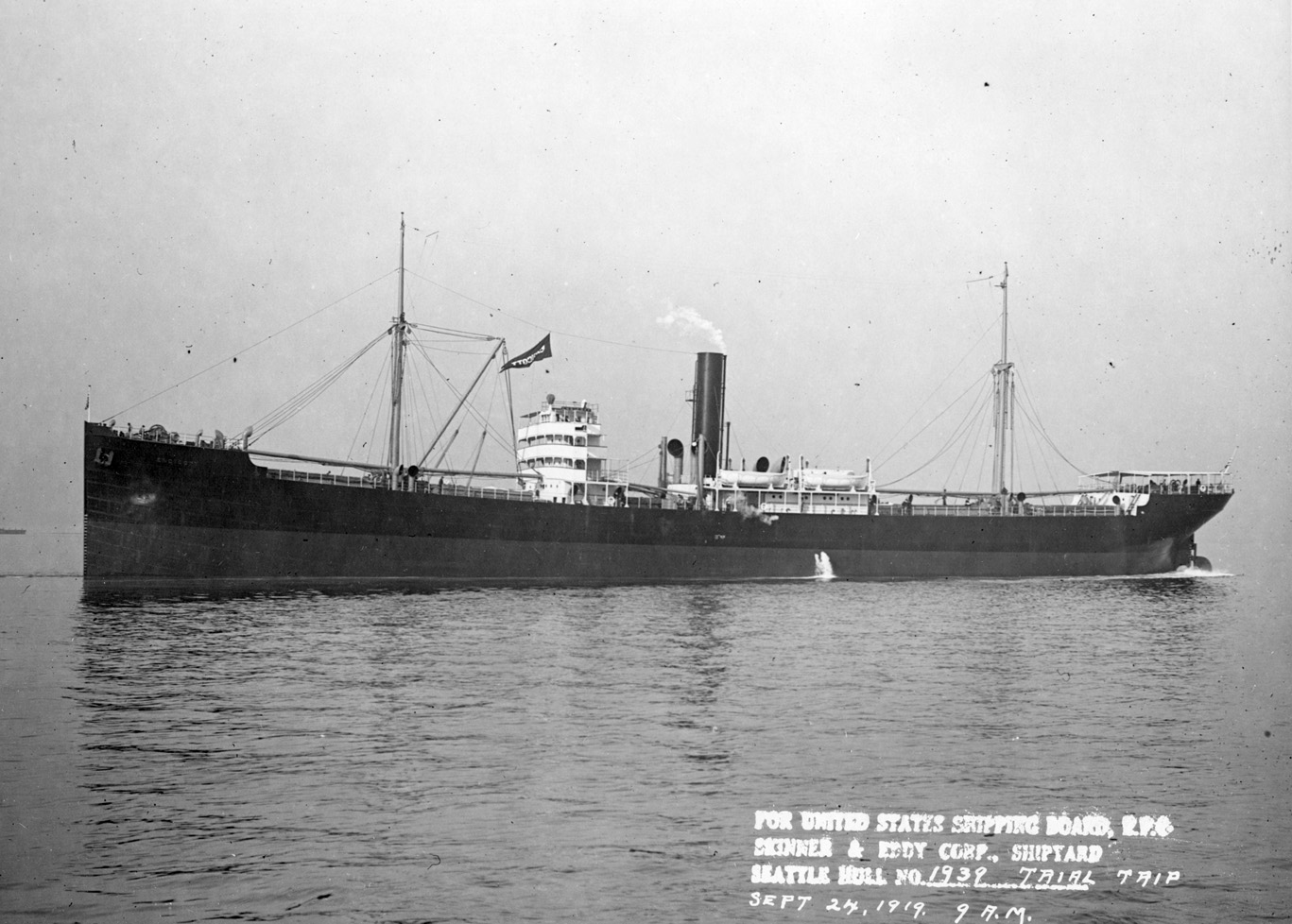 | S.S. Endicott (Design 1105, EFC Hull 1939) on a trial trip on 24 September 1919 after completing construction by the Skinner & Eddy Corp. Yard No. 2, Seattle, Wash. (NARA: RG-32-UB) (Click photo to enlarge) |