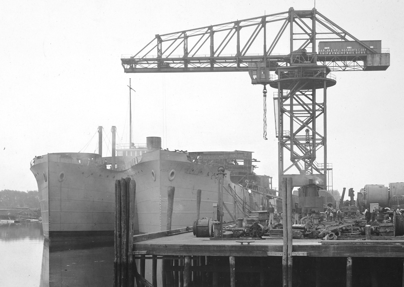 S.S. Biran and Garibaldi (Yard nos. 455-6/3455-6) Fitting out at their builder's yard on 27 May 1918. Biran on the left has her forward pair of derrick posts, forward gun platform, and amidships wireless mast in place while workers are installing the gun platform on the bow of the less advanced Garibaldi on the right. Biran was delivered to the EFC on 13 June 1918 and Garibaldi followed on 28 June 1918. Photo No. 165-WW-493F-011 Source: U.S. National Archives, RG-165-WW |