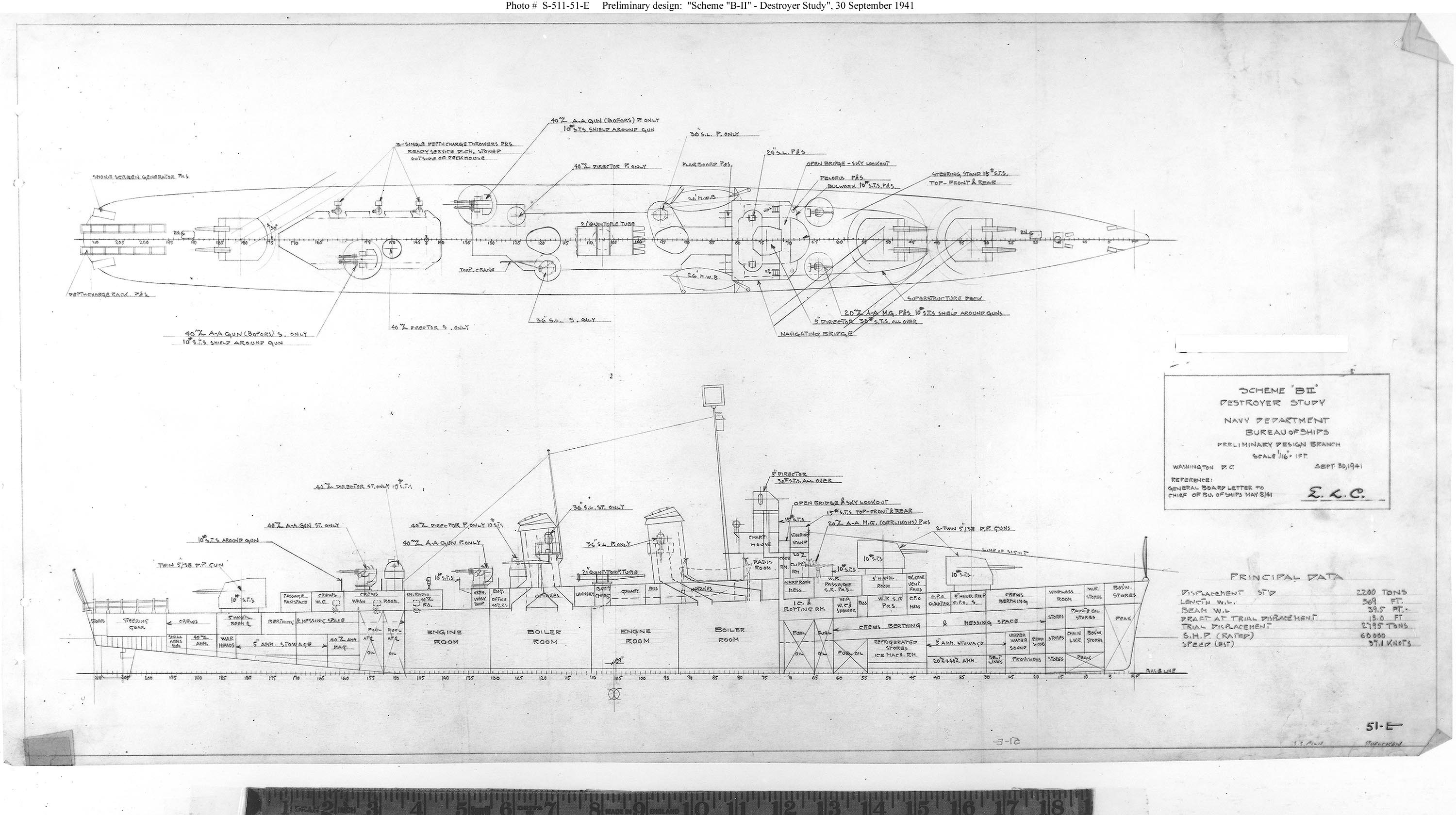 Photo #: S-511-51-E "Scheme "B-II" - Destroyer Study" Preliminary design plan prepared for the General Board as part of the process leading to the Allen M. Sumner (DD-692) class design. This 30 September 1941 plan, for a 2200-ton (standard displacement) ship, introduces the twin 5"/38 dual-purpose gun mount as a destroyer weapon. Three of these are provided, as well as two twin 40mm anti-aircraft guns and a single bank of five torpedo tubes, giving a less crowded arrangement amidships. Further developed as Scheme "B-VII" of 10 March 1942, this became the basic DD-692 design. The original plan is in the 1939-1944 "Spring Styles Book" held by the Naval Historical Center. U.S. Naval Historical Center Photograph. Online Image: 525KB; 3000 x 1680 pixels |