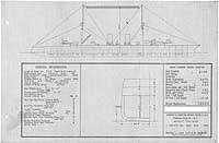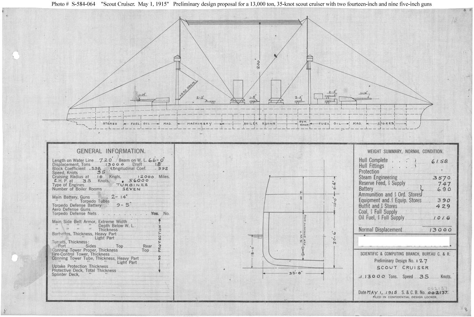 Photo #: S-584-064 Preliminary Design No.127 for a Scout Cruiser ... May 1, 1915 Preliminary design plan for a large scout cruiser, prepared to support General Board discussions concerning the characteristics sought in future Cruisers. This plan provided two 14-inch guns and nine 5-inch guns and a speed of 35 knots in a ship 720 feet long on the load water line, 66 feet in beam, with a normal displacement of 13,000 tons. This design included no armor protection and thus added only 2,500 tons displacement over design No.112. This design was first in a set of three requested as a group in late April 1915, apparently to further explore tradeoffs among armament, protection, and size in large scout cruisers carrying a minimum number of heavy guns and capable of 35 knots speed. This design series took Preliminary Design No.112 (see Photo # S-584-050) as a baseline. Ultimately, however, no ships of this type were built. Note: The original document was a blueprint (white on blue). The original plan is in the 1911-1925 "Spring Styles Book". U.S. Naval Historical Center Photograph. Online Image: 208KB; 1600 x 1070 pixels |