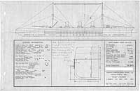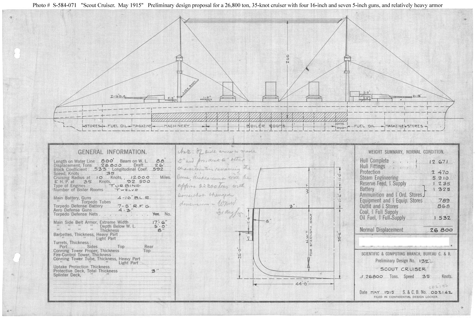 Photo #: S-584-071 Preliminary Design No.132 for a Scout Cruiser ... May 1915 Preliminary design plan for a large scout cruiser, prepared to support General Board discussions concerning the characteristics sought in future cruisers. This plan provided four 16-inch guns and seven 5-inch guns and a speed of 35 knots in a ship 800 feet long on the load water line, 88 feet in beam, with a normal displacement of 26,800 tons. This design included 2,470 tons of armor protection, including 8-inch side armor over 400 feet by 17 feet 6 inches amidships and 3-inch deck protection, and a displacement increase of 16,300 tons over design No.112. This design was last of a group of three undertaken during May 1915, apparently to further explore tradeoffs among armament, protection, and size in large scout cruisers. This design series took Preliminary Design No.112 (see Photo # S-584-050) as a baseline. Ultimately, however, no ships of this type were built. Note: The original document was a blueprint (white on blue). The original plan is in the 1911-1925 "Spring Styles Book". U.S. Naval Historical Center Photograph. Online Image: 218KB; 1600 x 1070 pixels |