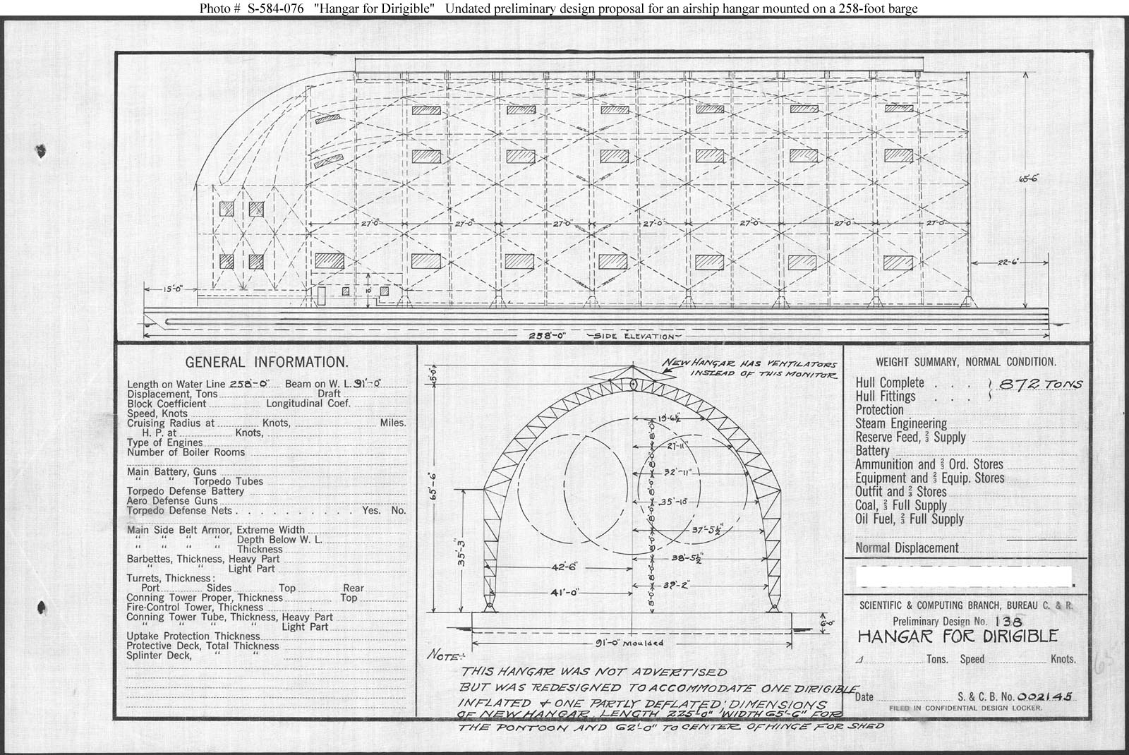 Preliminary design plan for a barge. This craft was designed to house two fully-inflated DN-1 dirigibles, but the vessel actually built was somewhat smaller, having room only for one inflated dirigible and one partly deflated. The craft, Hangar Barge # 1 (identified in 1920-21 correspondence as an unclassified district craft with file symbol YX-2), was built in 1916 but the hangar was dismantled soon after the unsuccessful DN-1 program was canceled. After several abortive schemes to alter the craft for other uses, it was disposed of by sale in 1921.