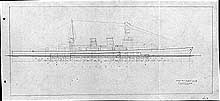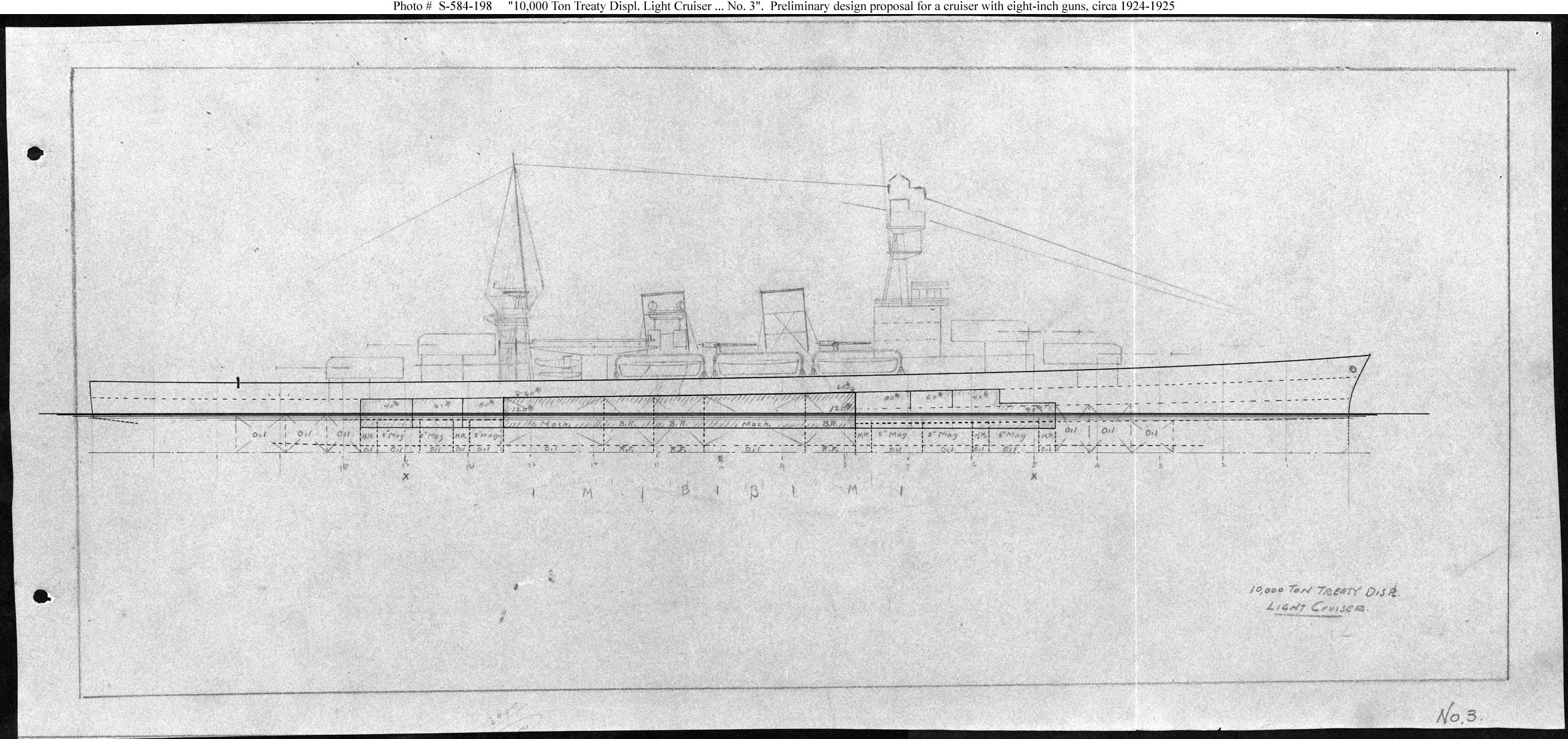 Photo #: S-584-198 Light Cruiser ... Design # 3 ... Undated (about January 1925) Preliminary design plan for a cruiser to be built under treaty limitations covering ships of up to 10,000 tons treaty displacement. This drawing represents a design that met most General Board characteristics for a ship that might be built under the Fiscal Year 1924 building program. This design provided the same heavy main gun armament as the baseline design (see Photo # S-584-190) but sacrificed some speed to obtain light armor protection and reduced weights. This incomplete sketch is very similar to the previous plan (see Photo # S-584-197) but appears to show a different, possibly expanded degree of side armor protection. This plan provided twelve 8-inch guns, turbine machinery, and a speed of 32.5 knots in a ship 600 feet long on the waterline, and with a normal displacement of 11,410 tons. Note: The original document was pencil and ink on paper (black on white). The original plan is in the 1911-1925 "Spring Styles Book". U.S. Naval History and Heritage Command Photograph. Online Image: 412KB; 2345 x 1105 pixels |