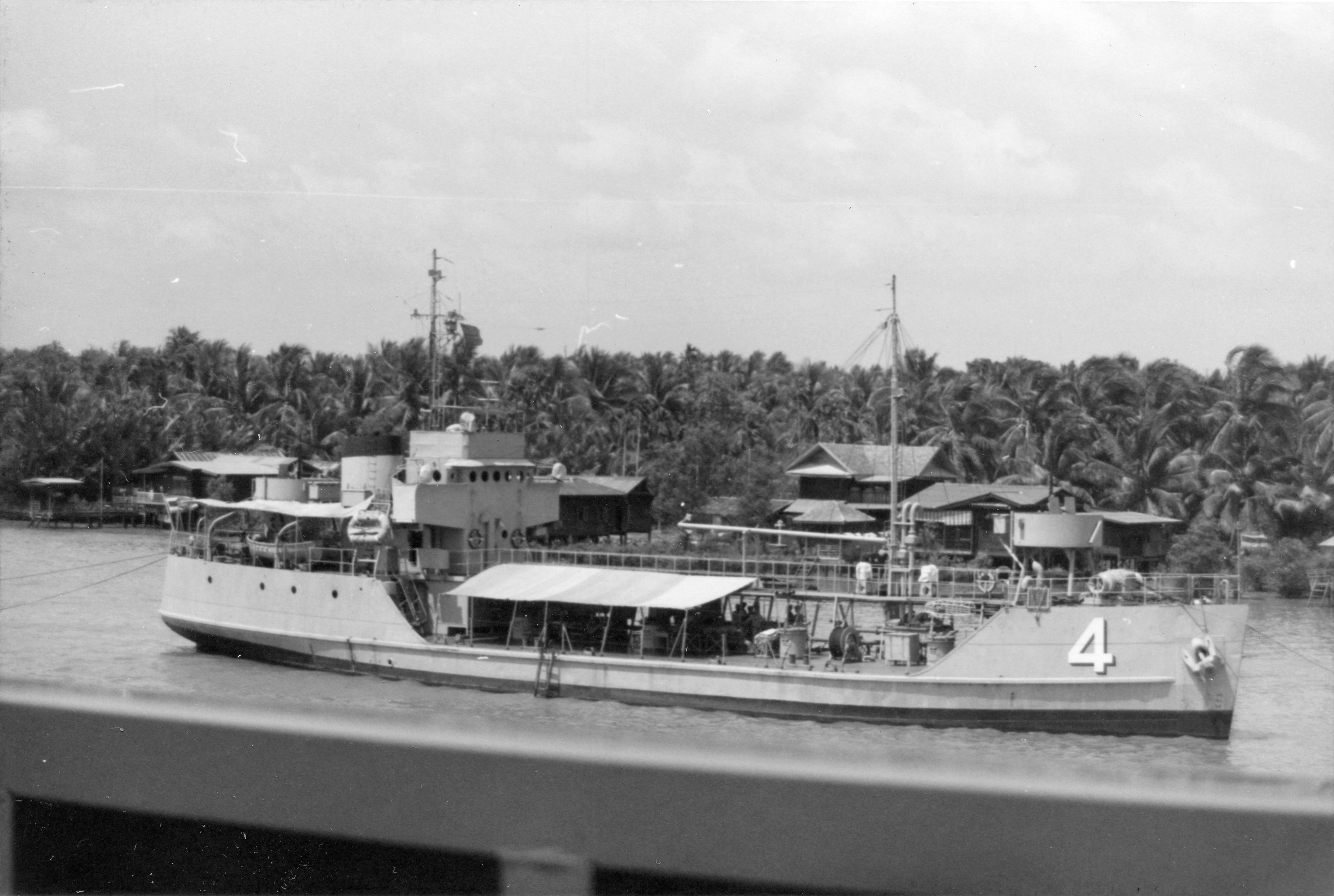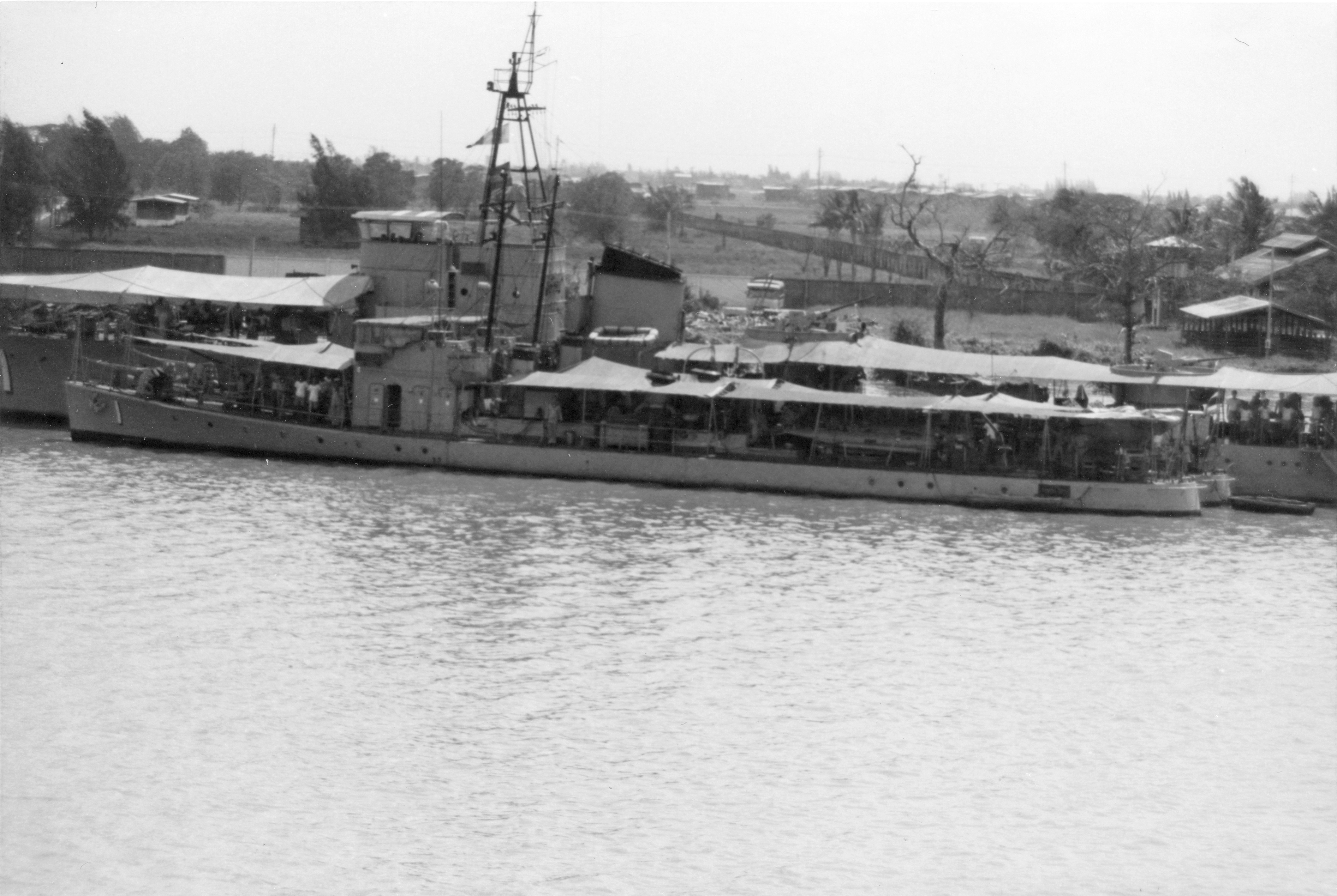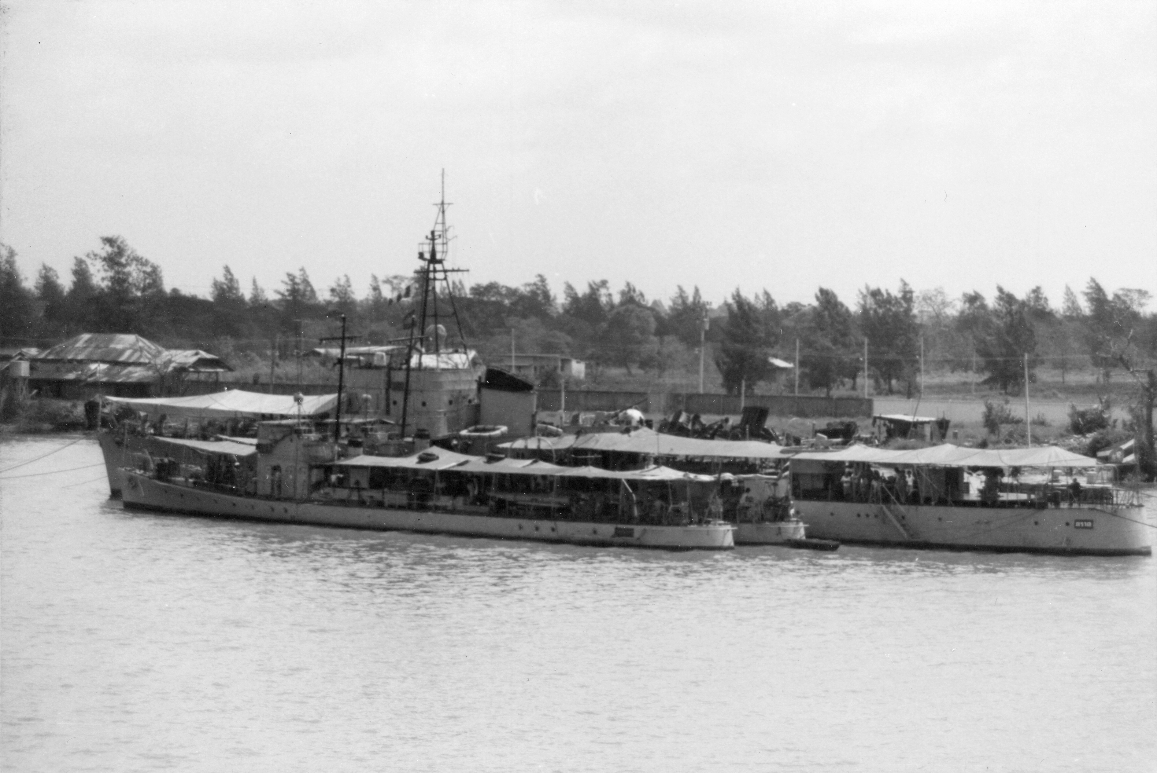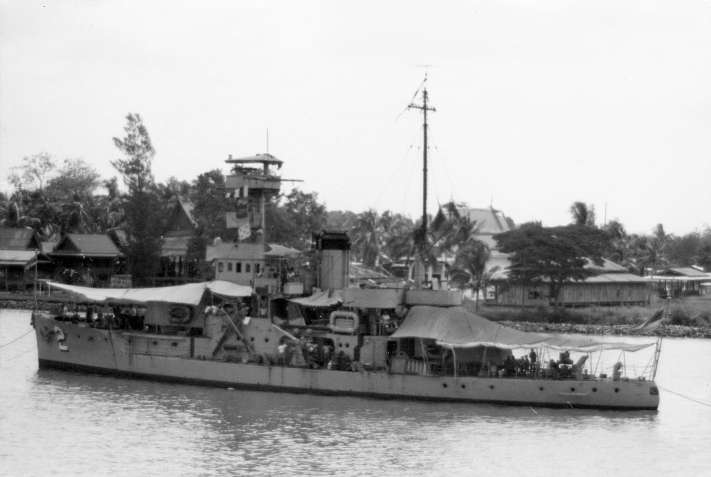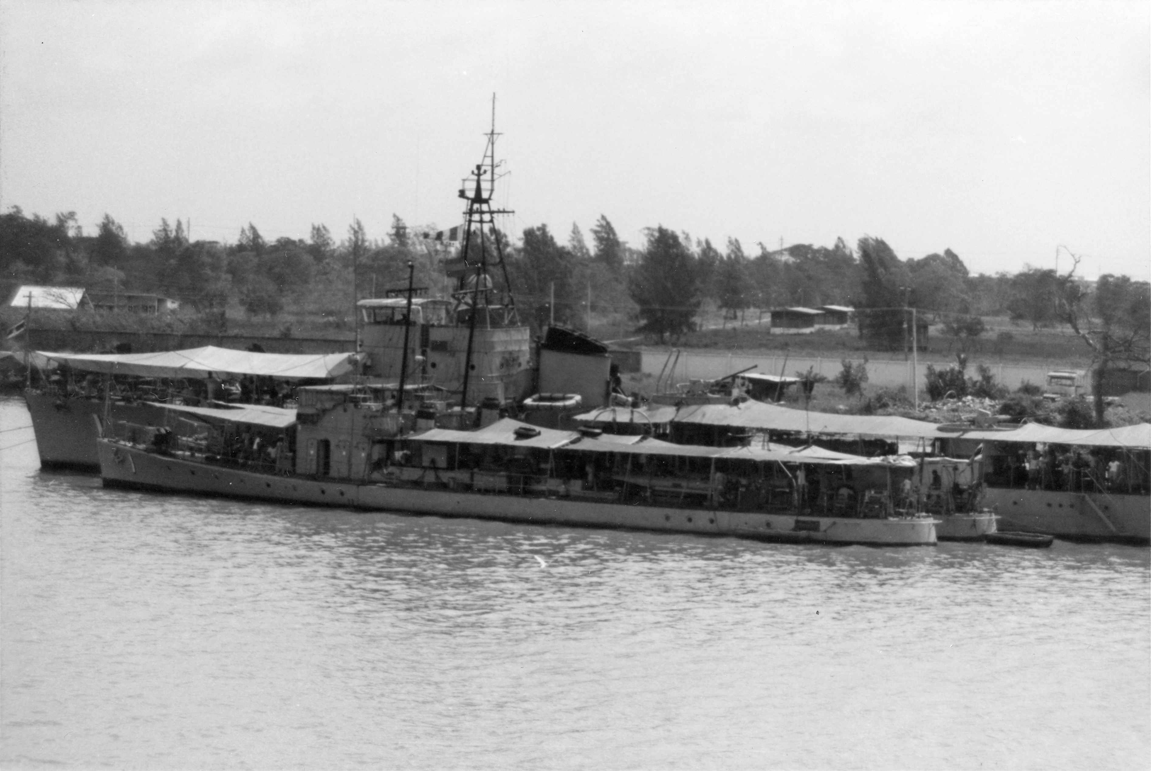 TRAD (Thai torpedo boat, 1935-1976) Photographed from USS BRADLEY (DE-1041) in the Chao Phraya River just below Bangkok on 24 February 1970. Outboard are the small torpedo boats KLONGYAI (#1) and KANTANG (#3, number not visible). Photo No: Replaces NH 92657 Source: Shipscribe |