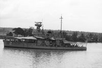 CHUMPOHN (Thai torpedo boat, 1937-1976) Photographed from the starboard bridge wing of USS BRADLEY (FF-1041) in the Chao Phraya River just below Bangkok on 24 February 1970. Outboard are the motor gunboats T-18 and (probably) T-16, still wearing their U.S. hull numbers. Photo No: Replaces NH 92661 Source: Shipscribe |