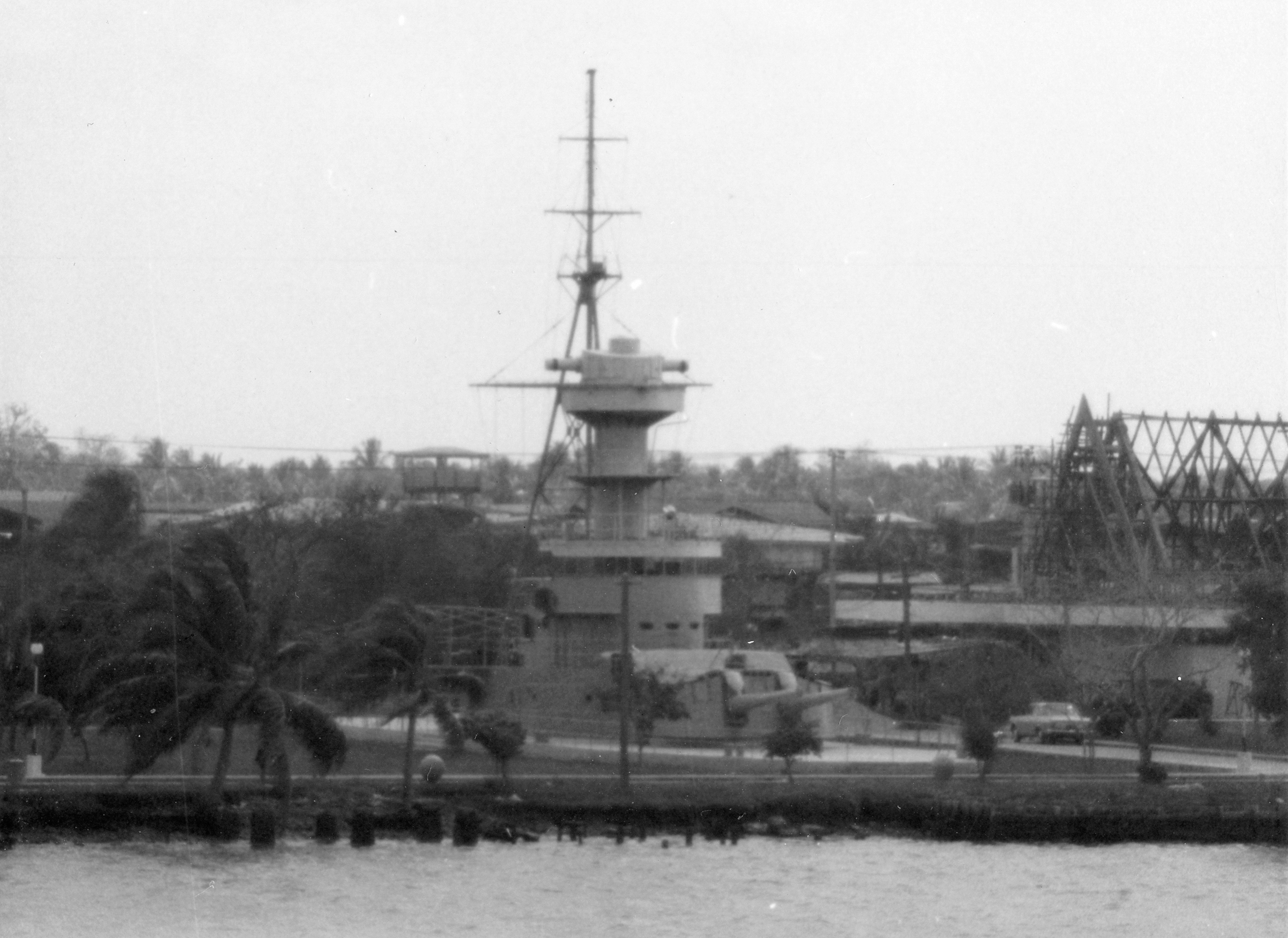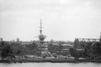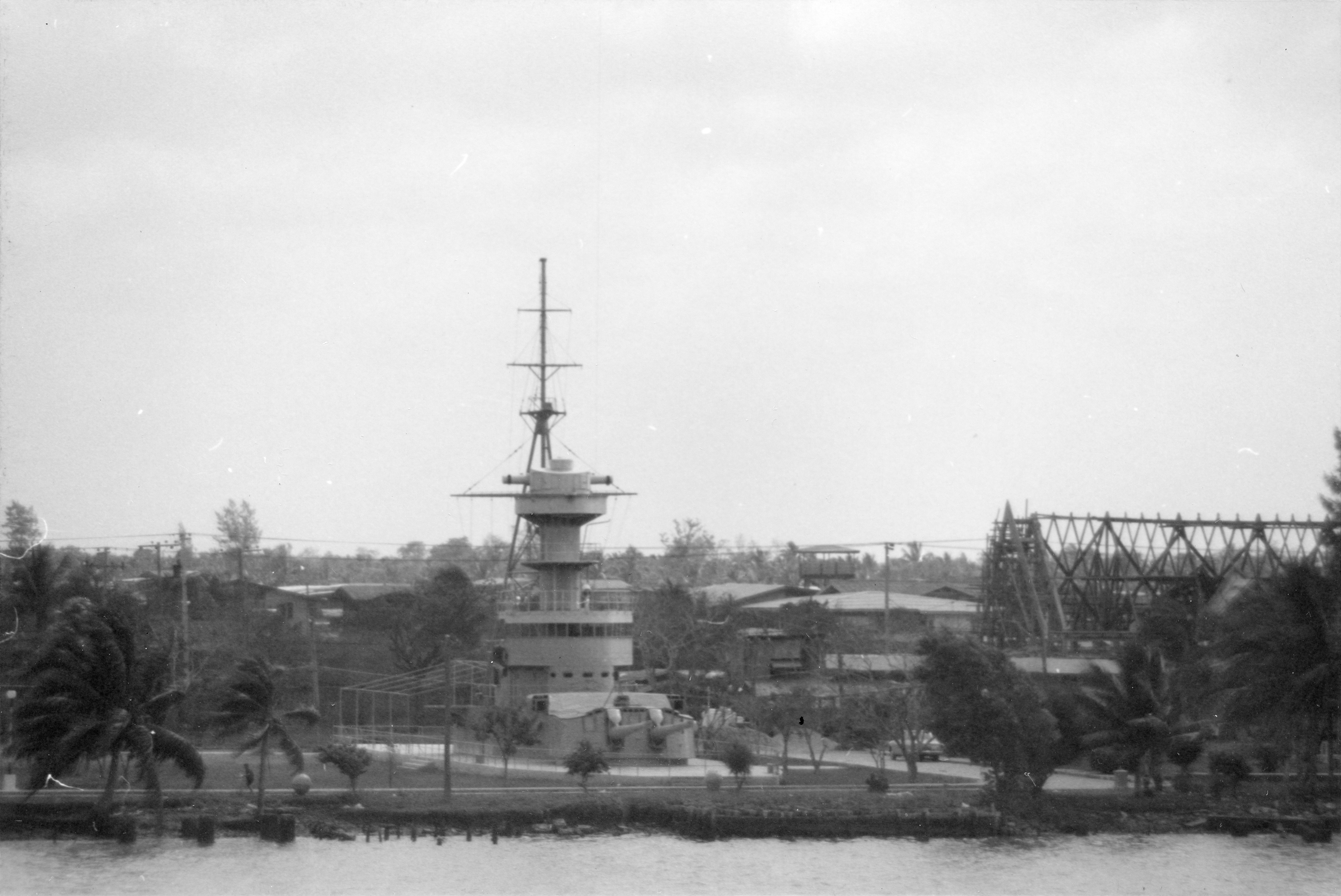 DHONBURI (Thai coast defense ship, 1938-1967) This view, taken from USS BRADLEY (DE-1041) in the Chao Phraya River on 24 February 1970, shows the bridge, foremast, and forward 8" turret of this ship as mounted ashore at the Naval Cadet Academy at Paknam after the ship was sold for scrap in 1967. She had been sunk by the French in 1941, raised by the Japanese, and subsequently used as a non-operational headquarters and training ship at Bang Na Naval Base. Photo No: Replaces NH 92655 Source: Shipscribe |