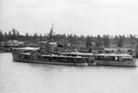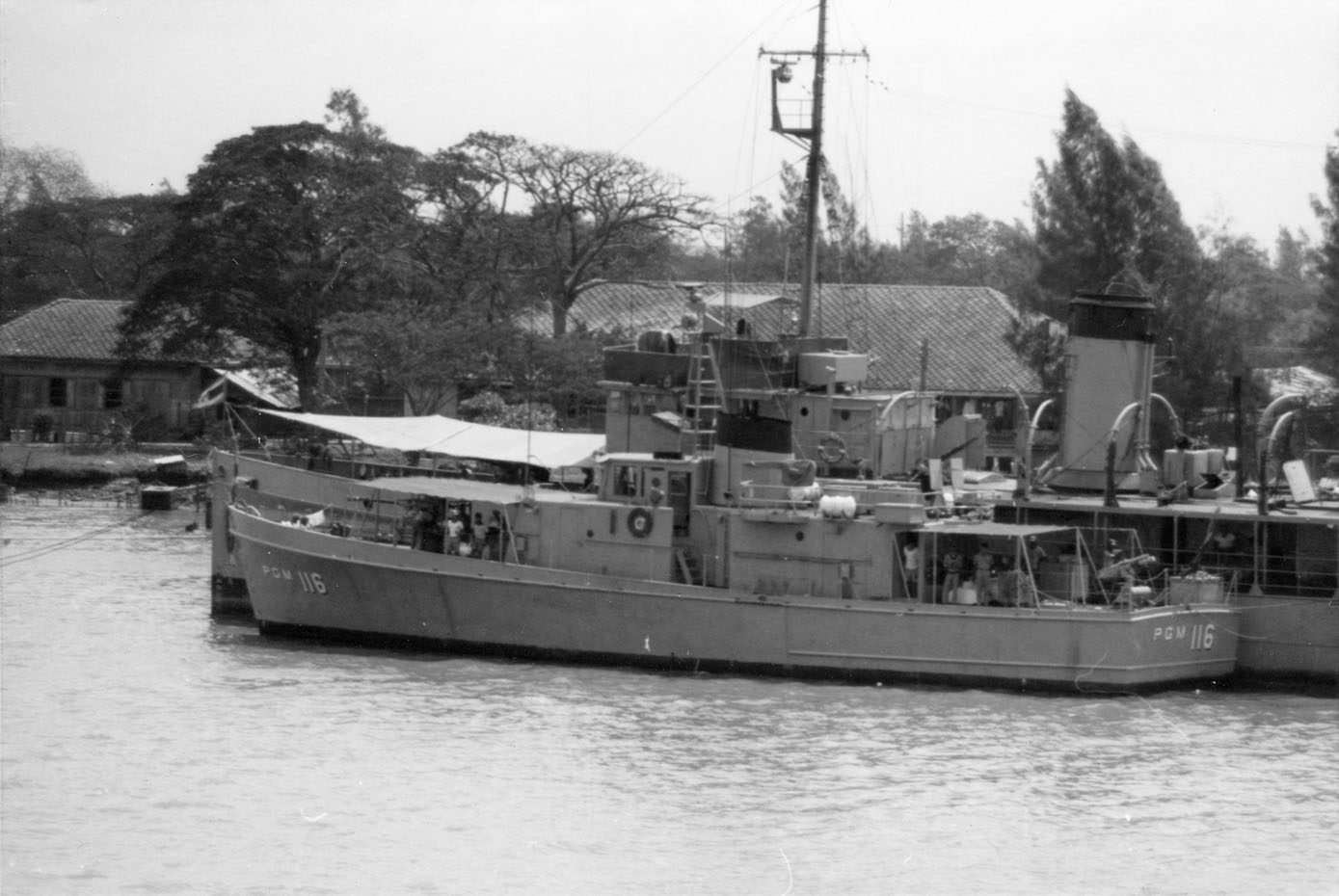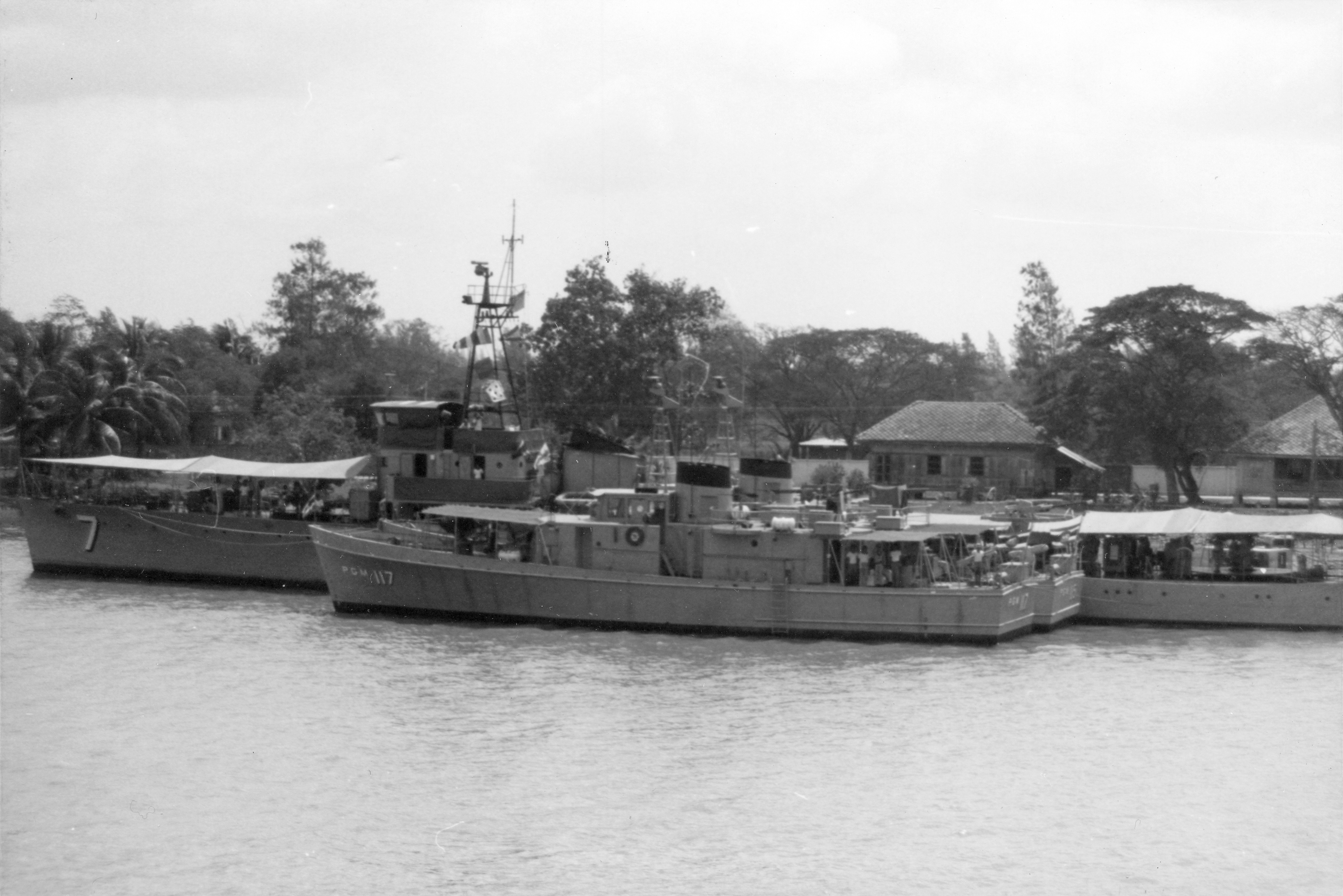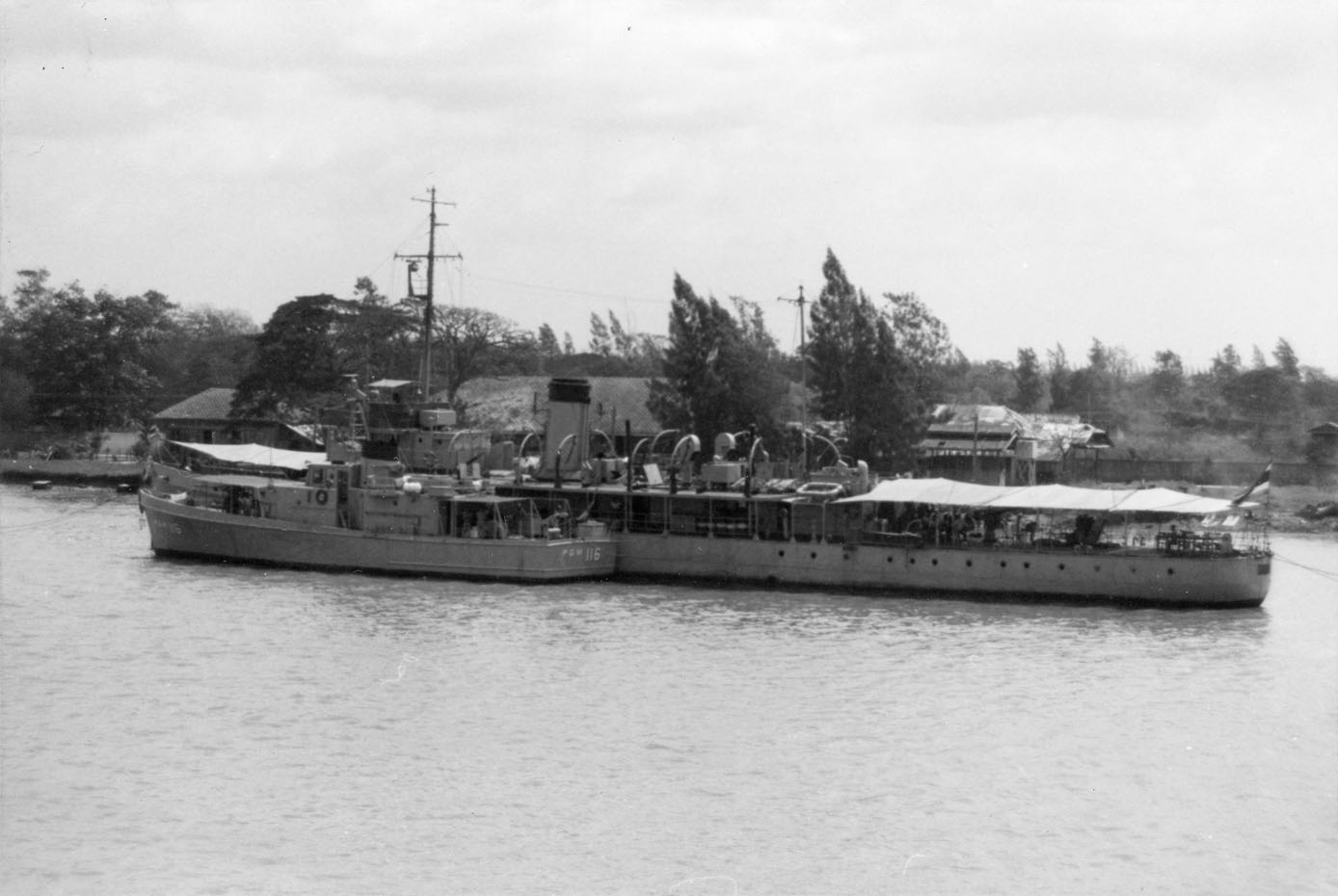 CHAO PHRAYA (Thai training ship, 1919) Photographed from USS BRADLEY (FF-1041) in the Chao Phraya River just below Bangkok on 24 February 1970. Outboard is the motor gunboat T-17, still wearing her U.S. hull number PGM-116. Chao Phraya was the former British minesweeper HAVANT, purchased in 1922 and still in use in 1981. Photo No: Replaces NH 92664 Source: Shipscribe |