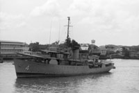 BANGPAKONG (Thai corvette, circa 1943) Photographed from USS BRADLEY (FF-1041) in the Chao Phraya River just below Bangkok on 24 February 1970. Built as HMS BURNET, she served as the Indian GONDWANA until sold to Thailand in 1947. She was still listed in 1981. Photo No: Replaces NH 92665 Source: Shipscribe |