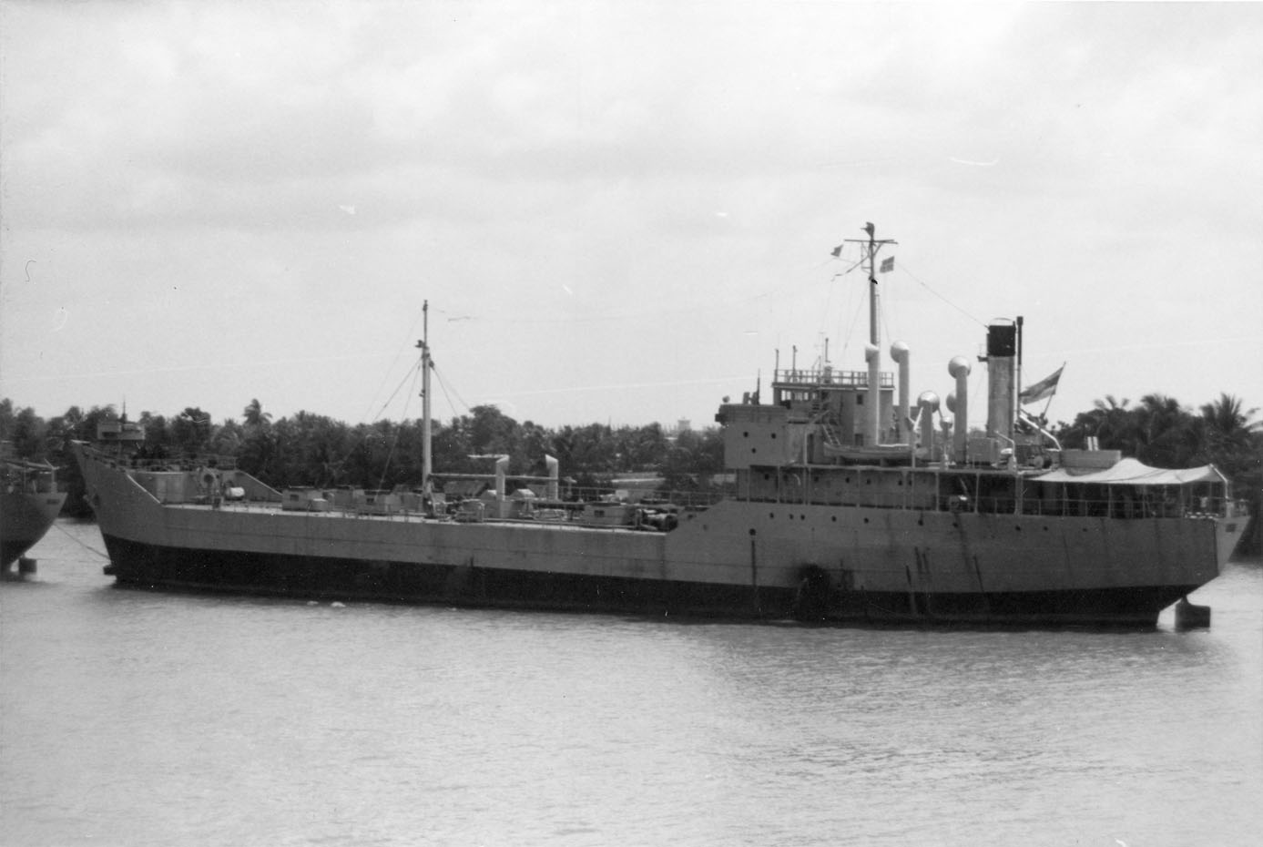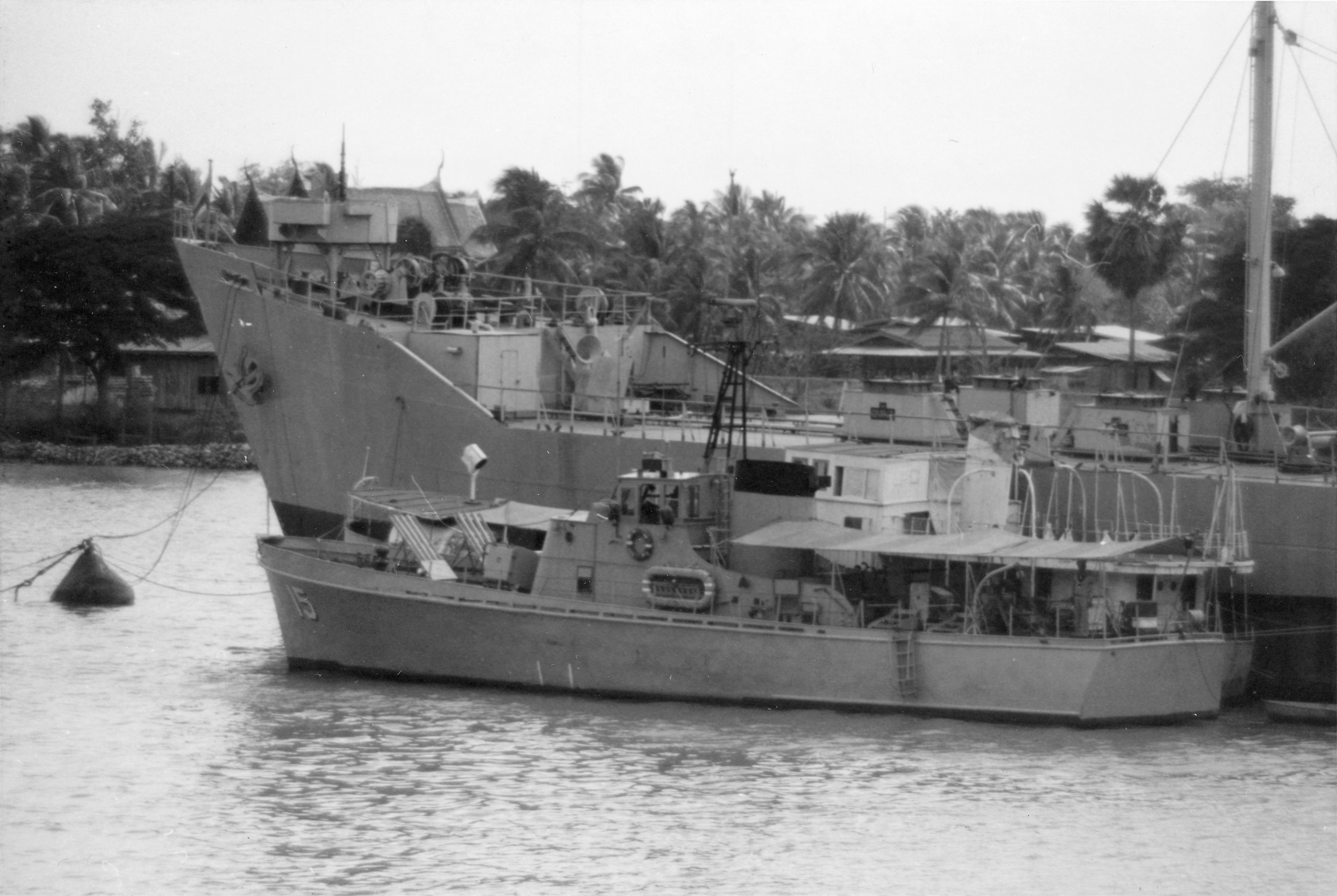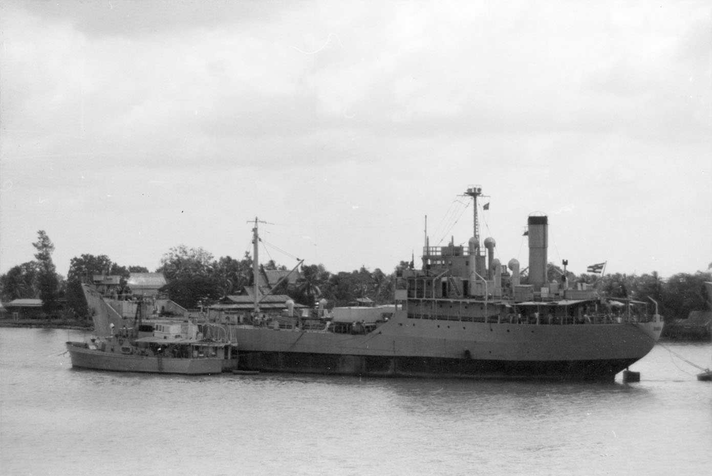 MATRA (Thai tanker, circa 1944) Photographed from USS BRADLEY (FF-1041) in the Chao Phraya River just below Bangkok on 24 February 1970, with the patrol craft CGC-15 alongside. MATRA can be distinguished from her sister CHULA by her rounded stern and the position of her flagstaff. Photo No: Replaces NH 92667 Source: Shipscribe |