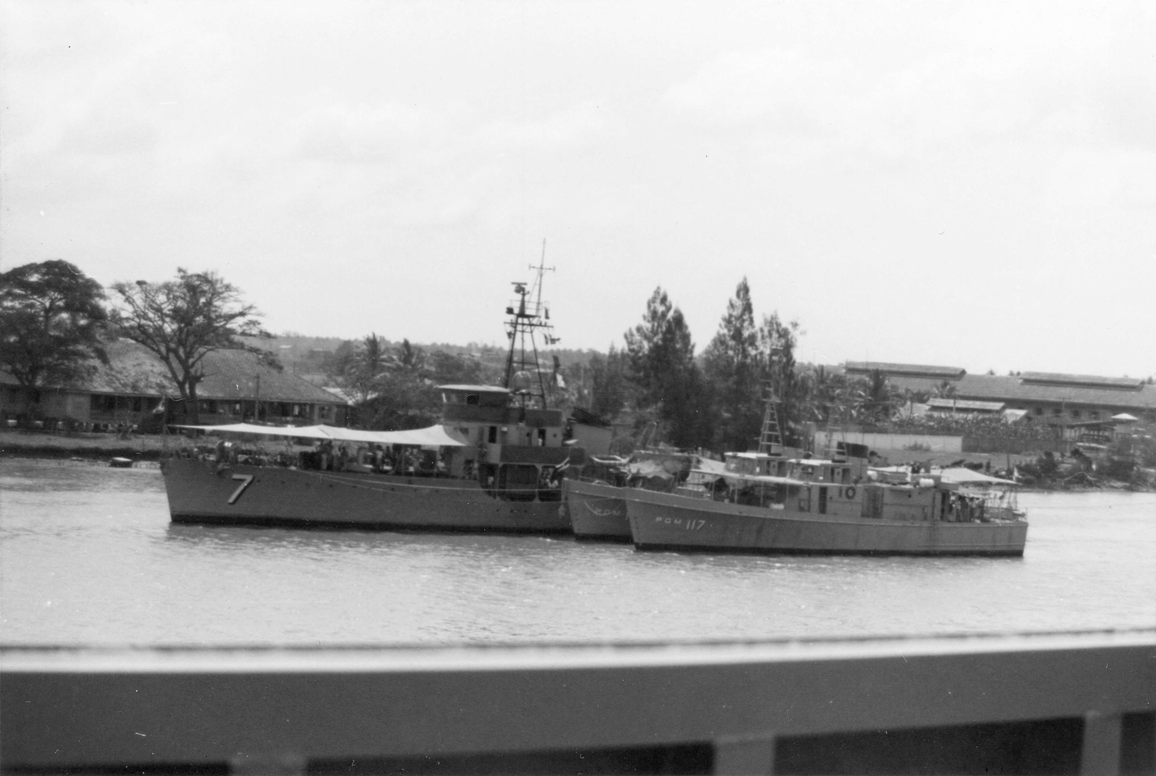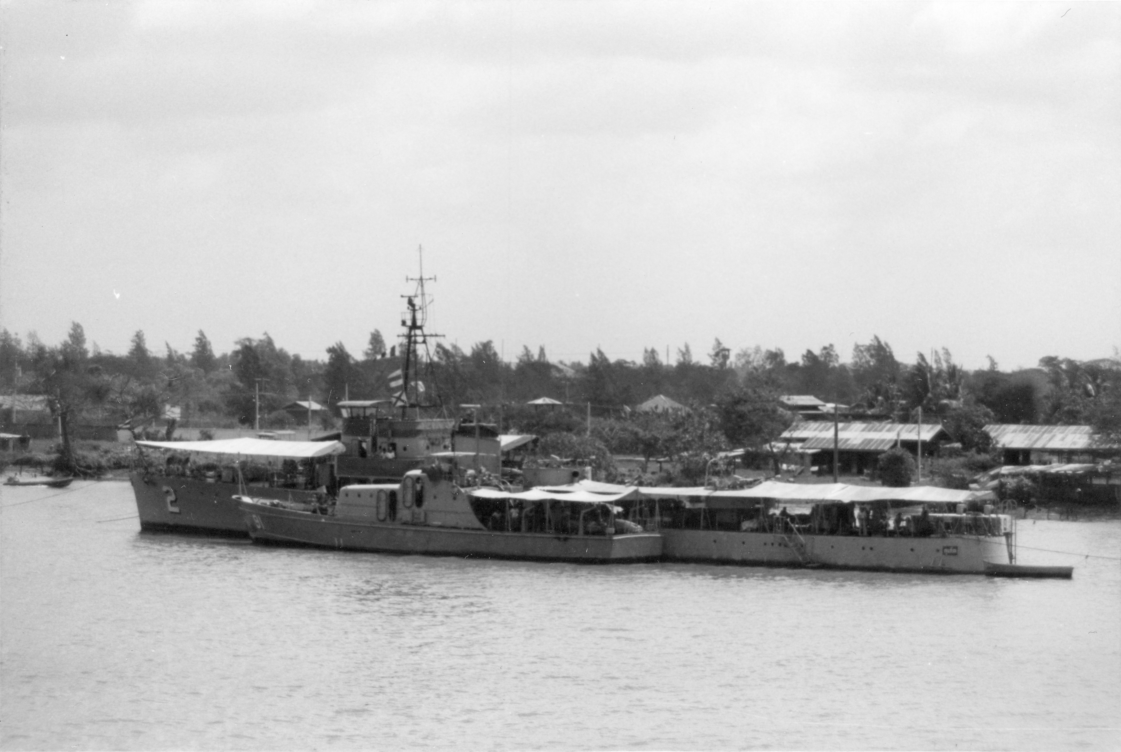 TRAD (Thai torpedo boat, 1935-1976) Photographed from USS BRADLEY (DE-1041) in the Chao Phraya River just below Bangkok on 24 February 1970. Outboard are the small torpedo boats KLONGYAI (#1) and KANTANG (#3, number not visible). Photo No: Not at NHHC, similar to NH 92656 Source: Shipscribe |