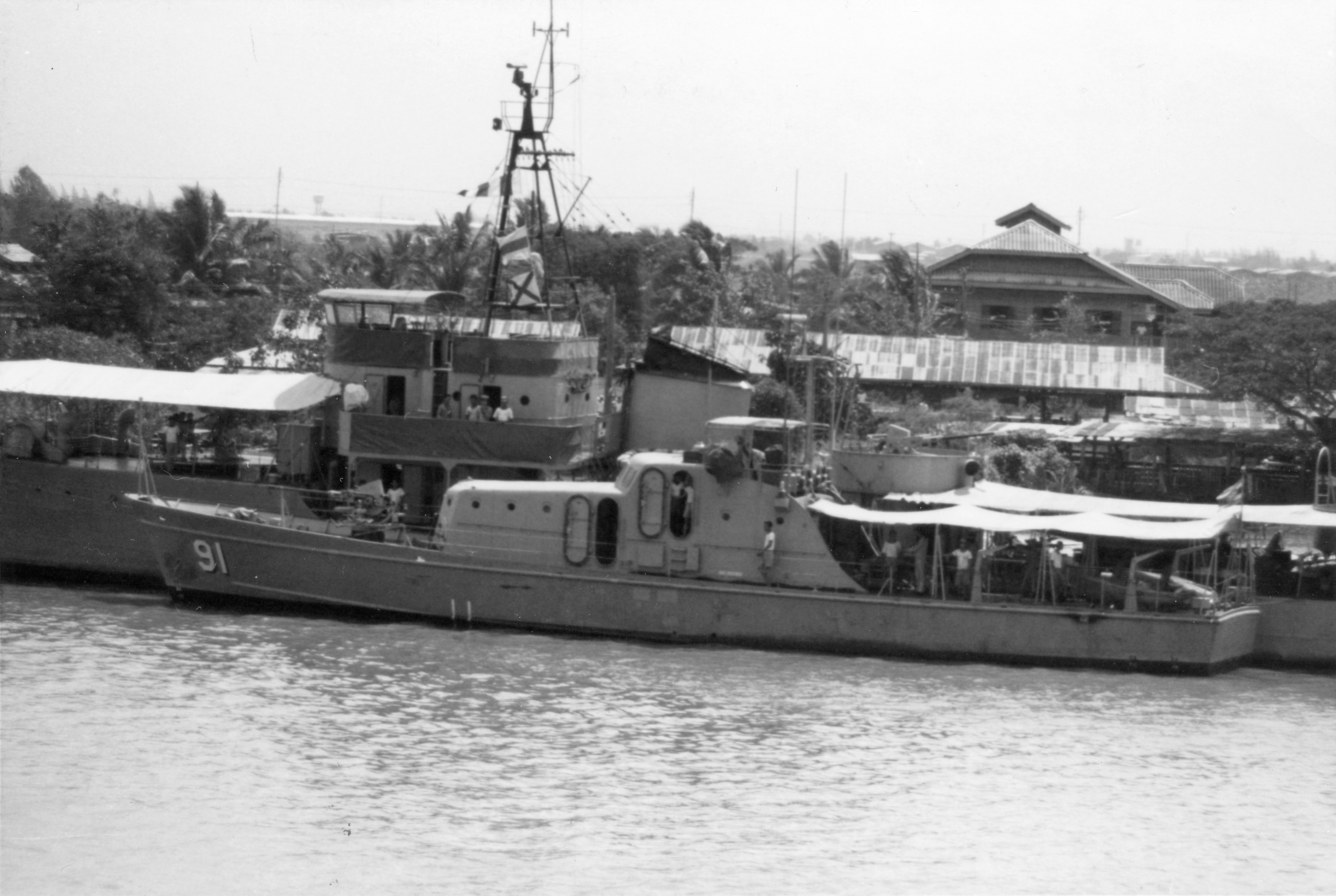 T-91 (Thai patrol boat, 1968) Photographed from USS BRADLEY (DE-1041) in the Chao Phraya River just below Bangkok on 24 February 1970. T-91 is alongside the torpedo boat PHUKET (1935-1976). Photo No: Replaces NH 92659 Source: Shipscribe |