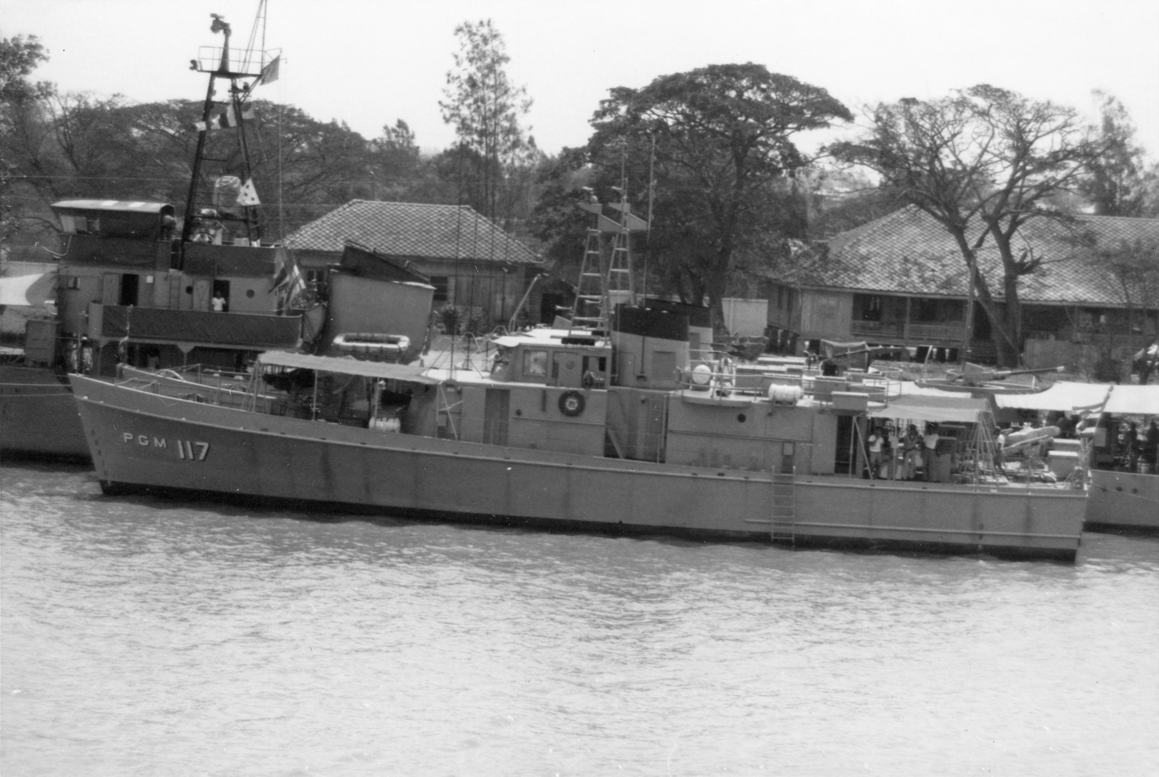 T-17 (Thai motor gunboat, 1970) Photographed from USS BRADLEY (FF-1041) in the Chao Phraya River just below Bangkok on 24 February 1970. Still wearing her U.S. hull number, this ship had just been commissioned into the Thai navy. She is alongside the ancient training ship Chao Phraya, ex HMS HAVANT. Photo No: Replaces NH 92663 Source: Shipscribe |