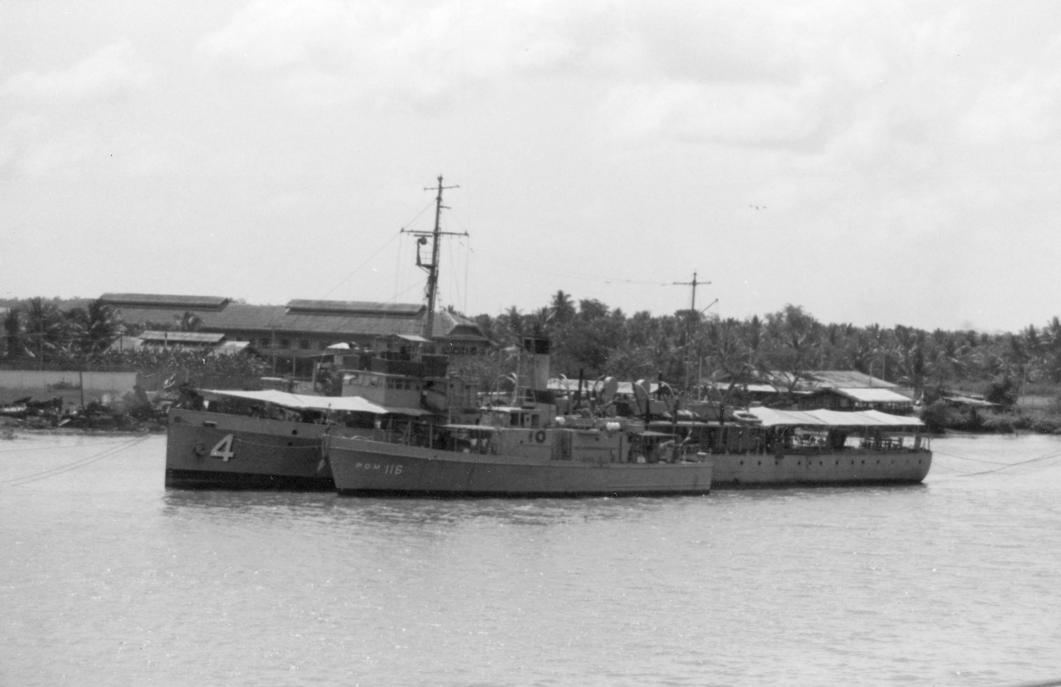 T-18 (Thai motor gunboat, 1970) Photographed from USS BRADLEY (DE-1041) in the Chao Phraya River just below Bangkok on 24 February 1970. T-16, T-17 and T-18, still wearing their U.S. hull numbers PGM-115, 116 and 117, had just been commissioned in the Thai navy when this photo was taken. The ship behind T-18 is probably T-16, and the larger ship behind both is the torpedo boat CHUMPOHN. Photo No: Replaces NH 92660 Source: Shipscribe |