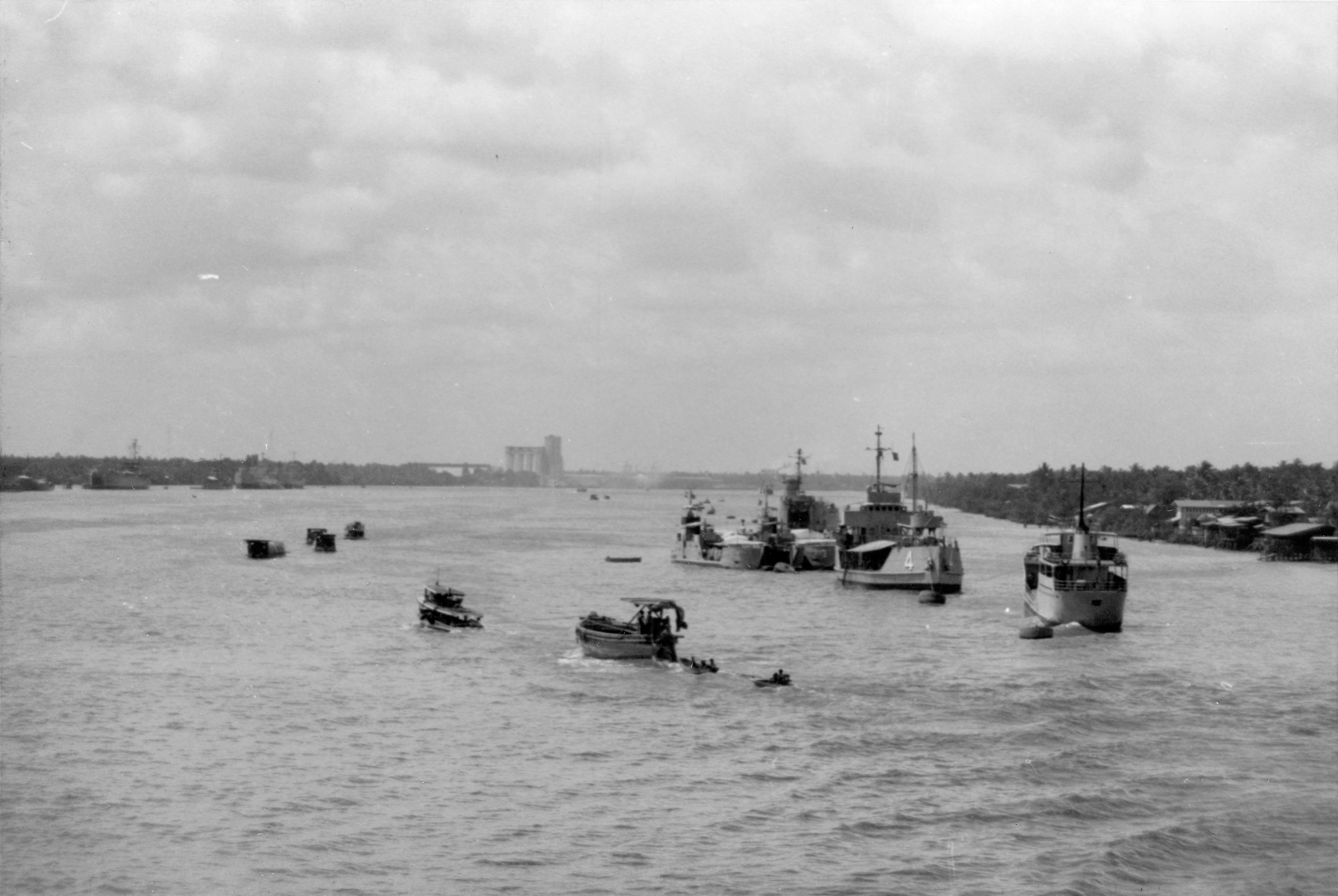 Thai Naval Craft Photographed from USS BRADLEY (FF-1041) in the Chao Phraya River just below Bangkok on 24 February 1970. From the right to left are the YO SAMIT (or PLOED), the YOG SAMUI, and the LCU ARDANG and PHETRA. The ship beyond the two LCUs is unidentified. Photo No: Replaces NH 92669 Source: Shipscribe |