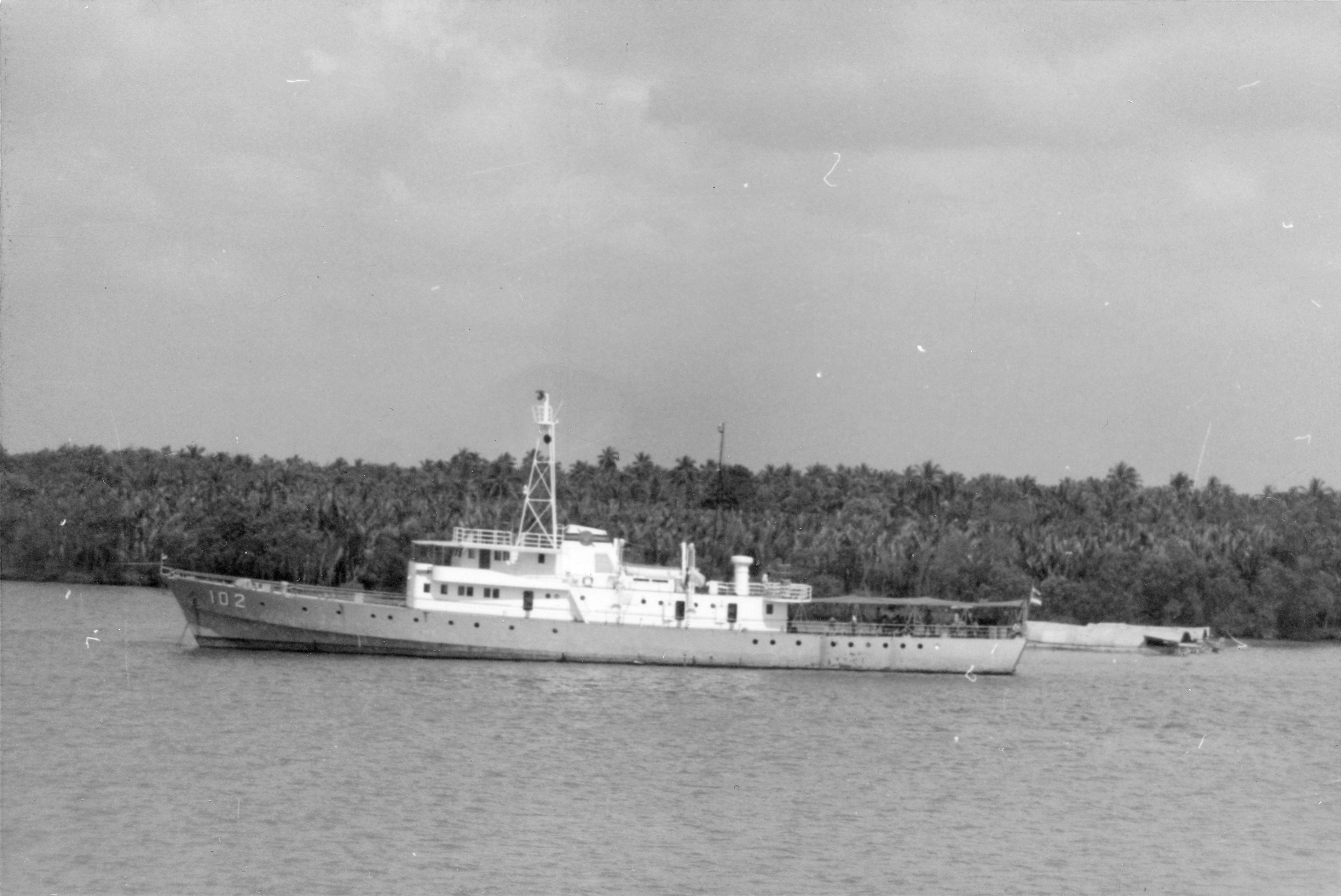 Thai Government Ship This unidentified ship, which appears to be a research vessel, was photographed from the USS BRADLEY (DE-1041) in the Chao Phraya River just below Bangkok on 24 February 1970. Photo No: Replaces NH 92673 Source: Shipscribe |
