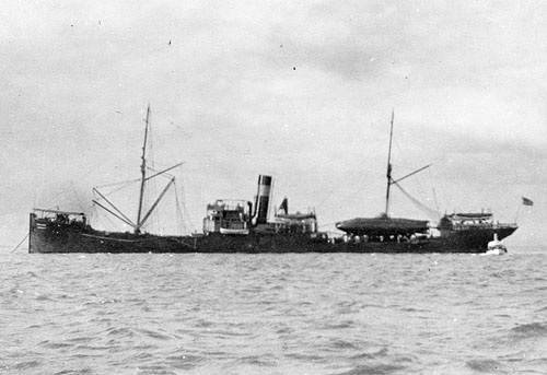 After supporting U.S. forces off Cuba during the Spanish-American War and except for brief periods out of commission between cruises, CAESAR was in continual use for over 20 years carrying Navy cargoes all over the world. For much of this time she was manned by a Naval Auxiliary Service merchant marine crew. CAESAR was fitted with a towing engine in 1905, and between December 1905 and July 1906 she with BRUTUS, GLACIER, and the tug POTOMAC towed the DEWEY drydock from Chesapeake Bay to Manila. A few years later she made two trips to take submarines to Manila Bay. USS PORPOISE and USS SHARK were transported out on her decks in April-July 1908, while USS ADDER and USS MOCCASIN went out in July-October 1909. Among the collier's other noteworthy activities were providing support for a 1906 scientific expedition to observe a solar eclipse in Spain, and carrying refugees and relief supplies in 1915-1916 as World War I fighting created turmoil in the eastern Mediterranean.
