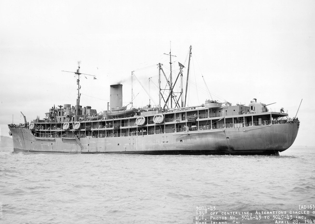 At Mare Island on 27 March 1943 as completed with four 5-inch guns and two heavy cranes.