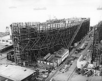 On the building ways at the Todd-Pacific shipyard at Seattle, Washington, probably around the time of her cancellation in January 1946.