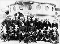 Photo #: NH 105464 USS Buffalo (1898-1927, later AD-8) One of the ship's divisions posing on the main deck in front of the pilot house during the 1914 Alaskan Radio Expedition. This division probably worked in this part of the ship. Note the Sailors inside the pilot house and the mascot, a bear cub, on a leash held by one of the division officers. Collection of Admiral Montgomery M. Taylor, donated by Louisa R. Alger, 1962 (NHF-164-B). U.S. Naval Historical Center Photograph. |