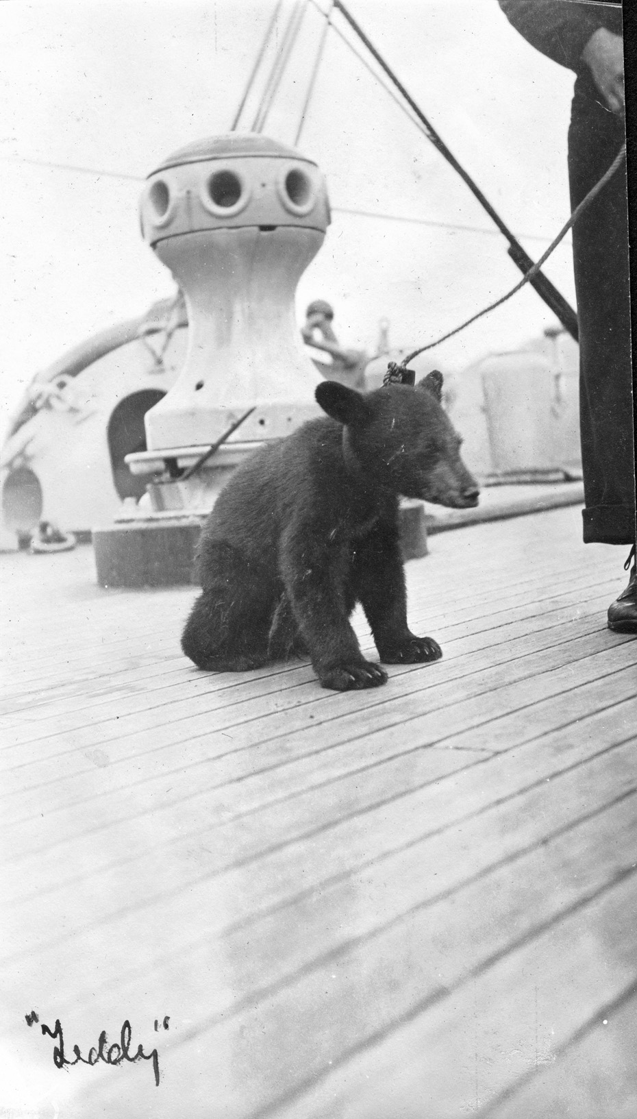 Photo #: NH 105596 USS Buffalo (1898-1927, later AD-8) "Teddy," a ship's mascot, on the ship's forecastle circa mid-1914 during the 1914 Alaskan Radio Expedition. "Teddy," probably an Alaskan bear cub, is also shown posing with one of the ship's divisions in Photo # NH 105464 above. Note the ship's capstain in the background. Collection of Admiral Montgomery M. Taylor, donated by Louisa R. Alger, 1962 (NHF-086). U.S. Naval Historical Center Photograph. |