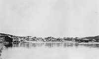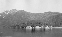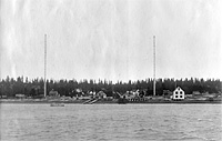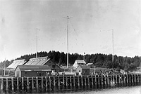 The coal sheds and dock at Sitka with the radio station behind them, photographed by USS Buffalo.