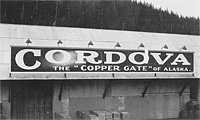 A sign on the wharf photographed by USS Buffalo. A pen note in the margin of the photo states "Cordova's reason for existence." The boxes piled on the wharf are marked "Elaine Oil," promoted as a "safe" fuel for oil lamps and made in Pittsburgh, Pa.