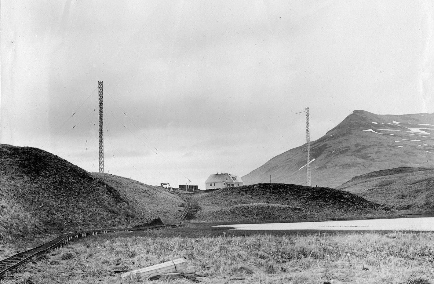 The completed station, photographed by USS Buffalo. The small railroad track was used to move building materials and supplies from boats at the shoreline to the station.