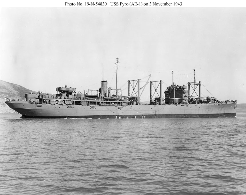 USS Pyro (AE-1) Near the Mare Island Navy Yard on 3 November 1943. The ship has been little altered since late 1942. Her after 1.1" quad mount is just forward of the two 5"/51 guns on the fantail and just aft of the two 3"/50 AA guns at the after end of the boat deck. She retains the boat davits next to her smokestack. Photo No. 19-N-54830 Source: U.S. National Archives, RG-19-LCM |