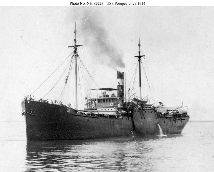 Pompey was then being used as a tender and storeship. She is wearing standard Naval Auxiliary markings including the inscription "Auxiliary, U.S. Navy, Pompey" on her bow.