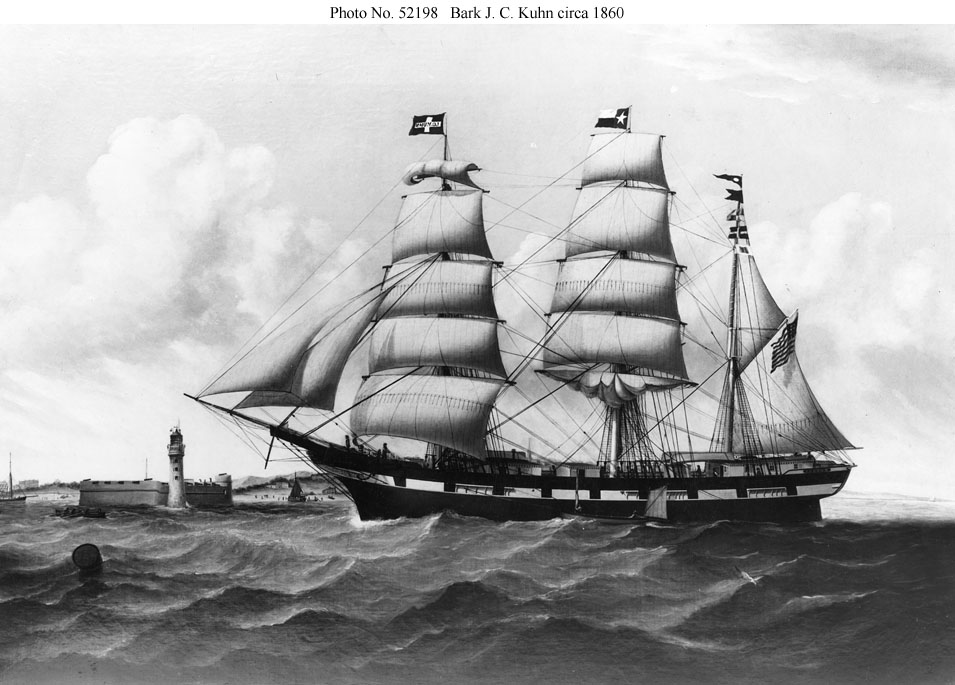 Bark J. C. Kuhn A probable different copy of the painting of the ship off Liverpool, England, in 1860 by Duncan McFarlane. She is flying the house flag of J. H. Brower & Co. of New York. The original painting may be viewed in color at www.vallejogallery.com. Photo No. NH 52198 (alternative) Source: Naval History and Heritage Command. |