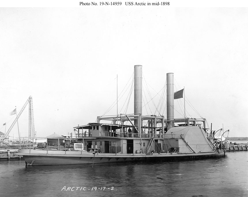 The vessel appears to have been a double ender, with a small pilot house aft and capable of breaking ice in either direction. The turret of the Civil War monitor Canonicus is visible behind her.