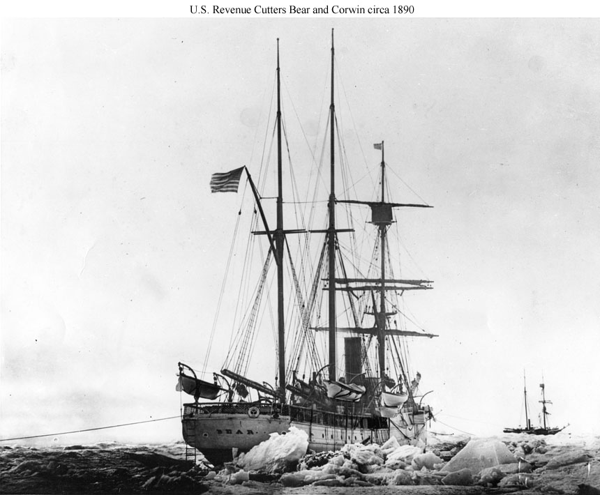 Shown circa 1890 in the ice off the northern coast of Alaska working to free herself and the trapped revenue cutter Corwin in the distance.