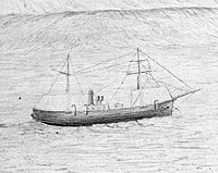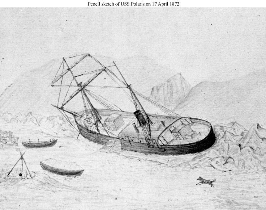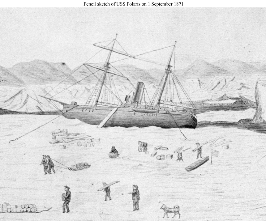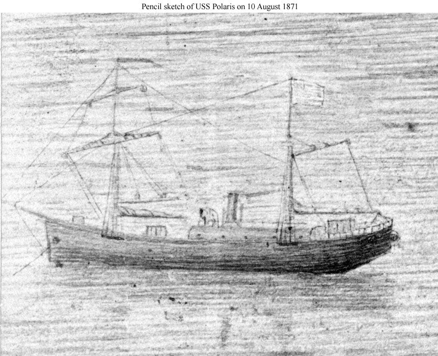 | The following five images are from a portfolio of pencil sketches drawn by Emil Schumann, Engineer of the Polaris expedition. They were photographed at the U.S. Treasury Department and published as a set of prints on boards. Some of these are now filed at the Naval History and Heritage Command as the Polaris Collection, NHF-019. The sketches were also used to illustrate Schumann's book, The Cruise of the Polaris, which was published by the Treasury Department. The images provided here are extracts showing the ship, but the ship was only an incidental part of most of the sketches, whose main aim was to show the Arctic and Greenland environment within which the expedition took place and some of the activities of the crew. |