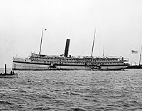 The San Francisco tug Fearless is assisting. On arrival local inspectors refused to grant this former coastal steamer a license for more trans-Pacific voyages carrying passengers because her deckhouses were "very high and not sufficiently fastened to the main deck."
