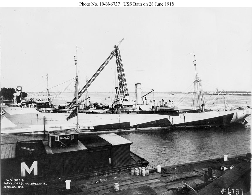 At the Philadelphia Navy Yard on 28 June 1918. Bath was at Philadelphia for repairs between 20 May and 30 June 1918. One gun in a shield is visible on the bow, none is visible aft. The ship is in pattern camouflage.