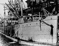 A possible gun platform on the bow no longer carries a gun. During the war the ship had 2-3"/50 guns, most likely one forward and one aft. She may be displaying her name above her pilot house windows, as was commenly done in ships of the Naval Overseas Transportation Service at this time.