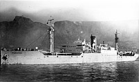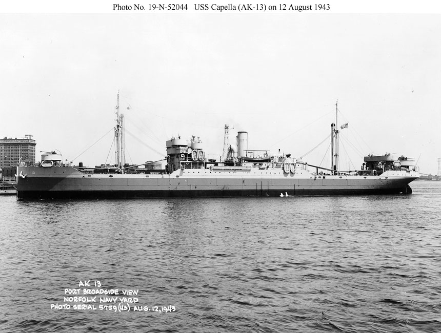 Her armament has been modified along the same lines as that of Capella in 1943, including a 5"/38 gun on the stern and two 3"/50s at each end of the ship, all on raised platforms.