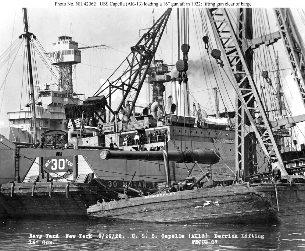 Transportation of oversized military cargoes was one of the primary missions of Navy cargo ships between the wars. The Merritt and Chapman Co. derrick Monarch has lifted the gun clear of the Moran Towing and Transportation Co. barge No. 30. The barge was then removed and the crane lowered the gun onto Capella. USS Maryland (BB-46) is across the pier.