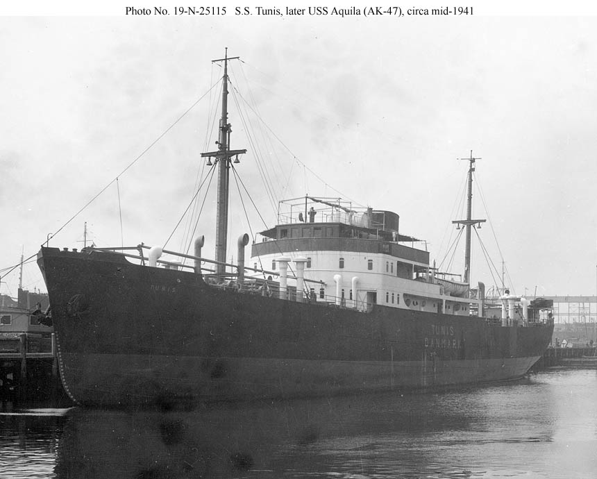 This Danish cargo ship is shown laid up at New York, probably in mid-1941 soon before she began conversion to USS Aquila (AK-47).