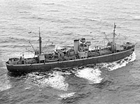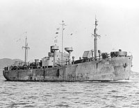Returning to San Francisco from the Western Pacific circa March 1946 following nearly a year of service as a semi-mobile dry cargo floating storage ship.