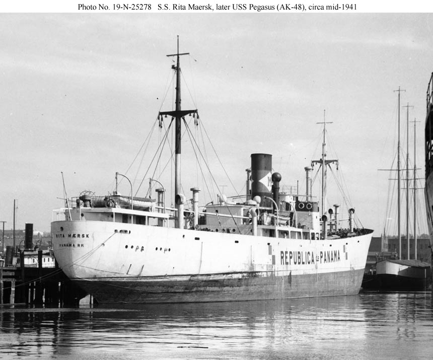 This Danish cargo ship is shown at New York, probably in mid-1941 soon before she began conversion to USS Pegasus (AK-48).