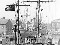 At the Norfolk Navy Yard on 23 February 1945 receiving repairs to storm damage and to main propulsion machinery problems.