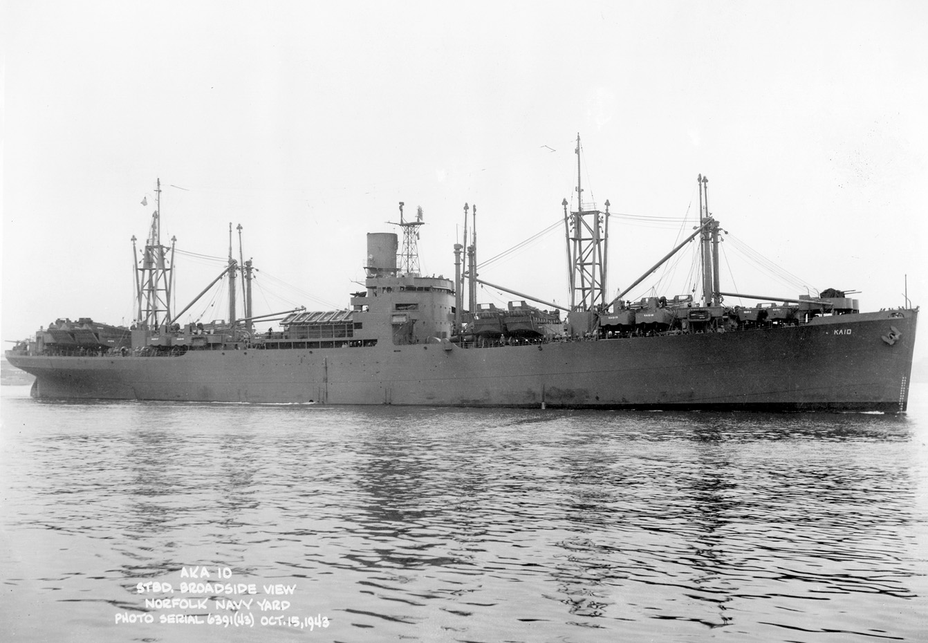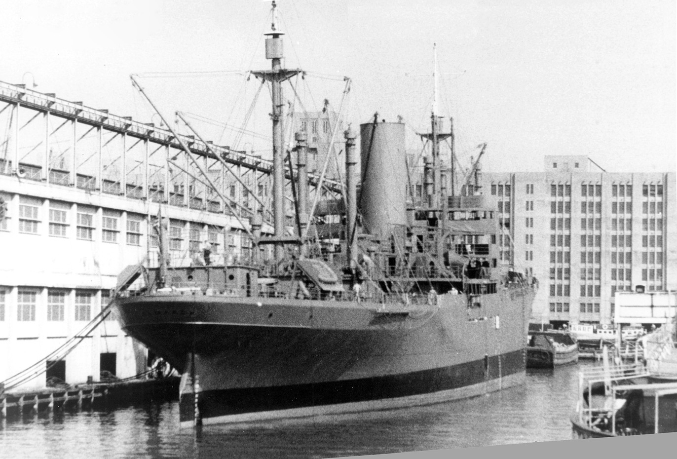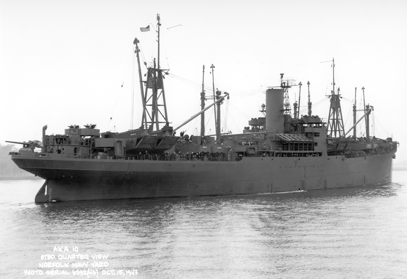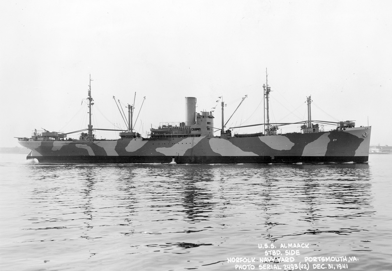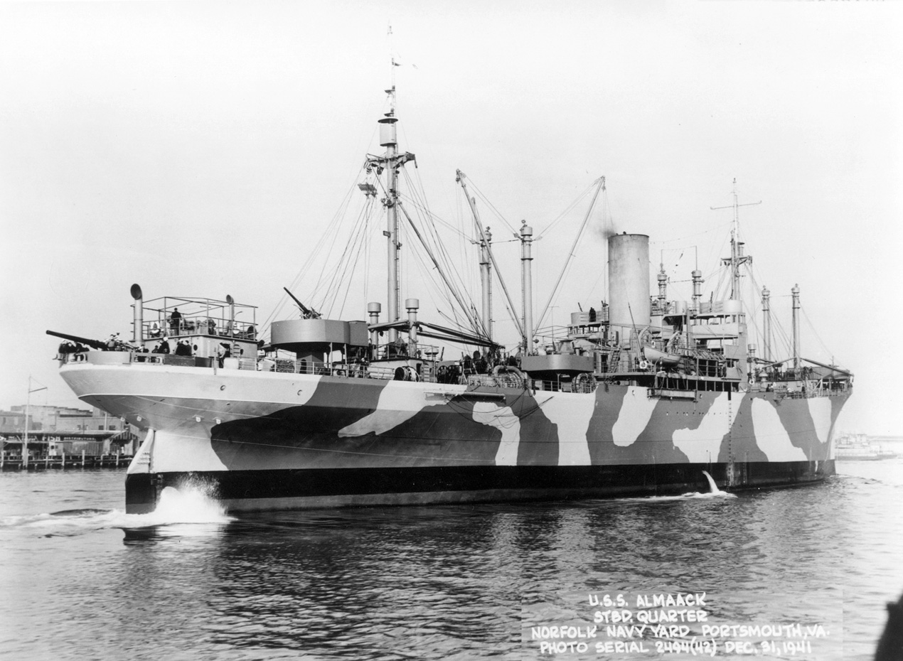 Off the Norfolk Navy Yard on 31 December 1941, showing her Measure 12 (mod.) camouflage and her newly-installed armament. Note the archaic counter stern favored by her original owner, American Export Lines.