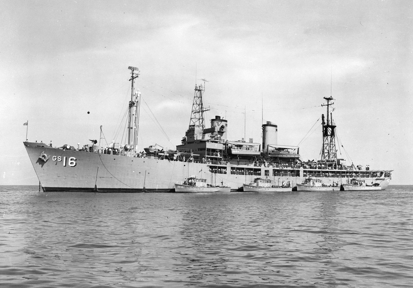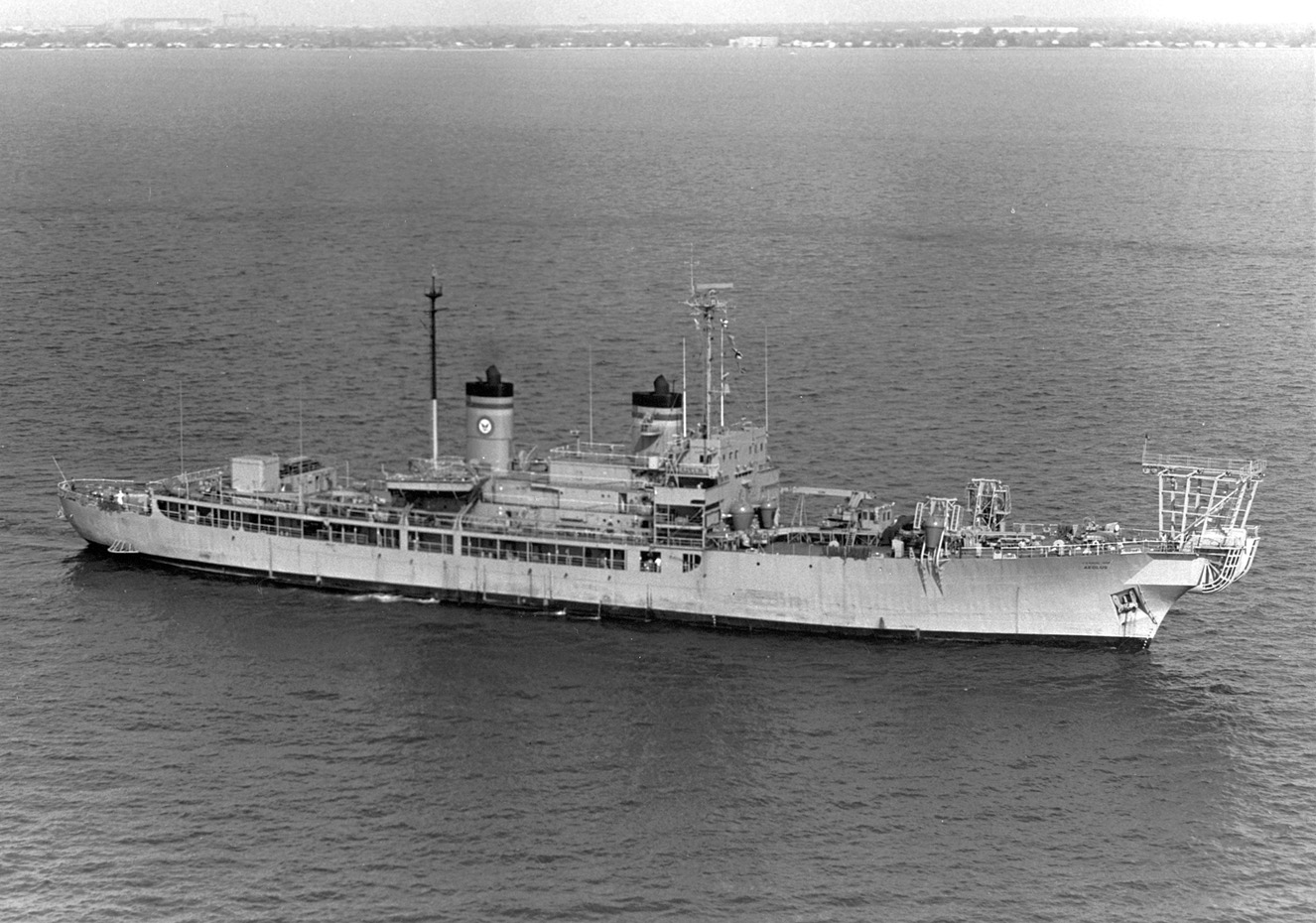 At anchor off the Mekong Delta in April 1967 with her four 32-ton soundboats lined up alongside. The tall lattice mast over the bridge was fitted to both ships in the late 1950s or early 1960s. A helo operates from the platform on the fantail, from which in the late 1940s she operated a Grumman J2F "Duck" seaplane.