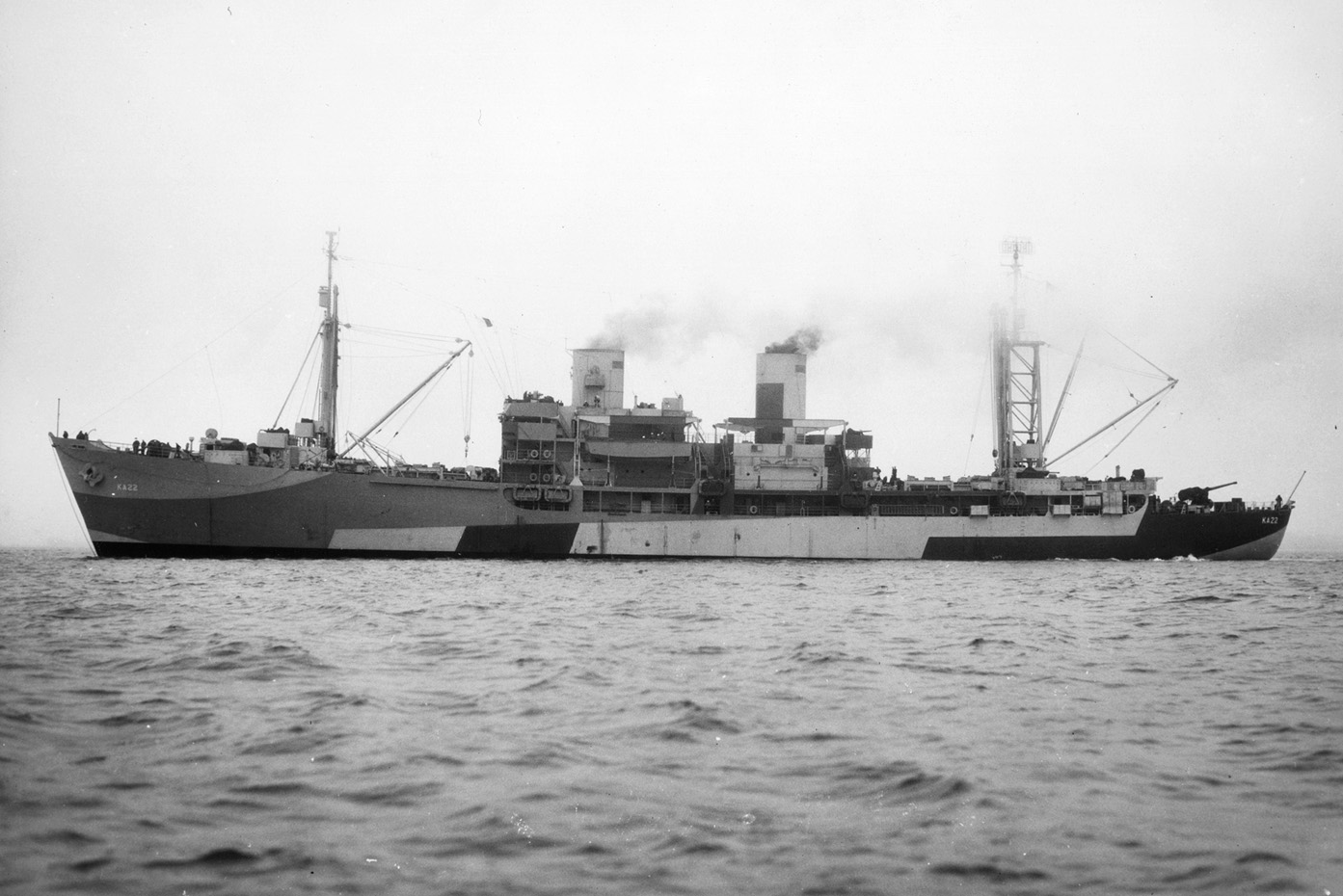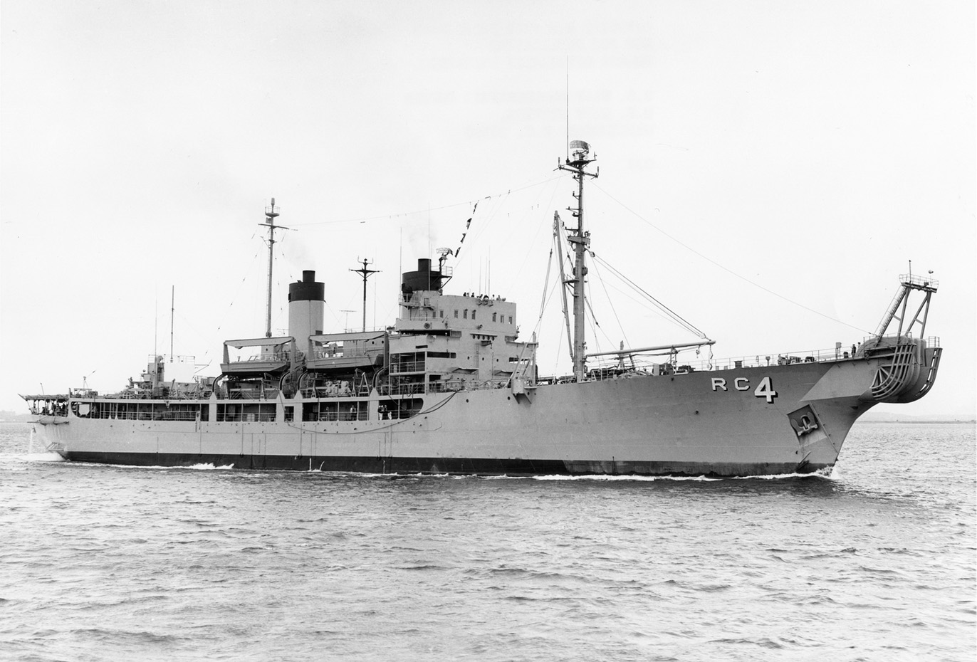 Operating as a MSTS ship off Norfolk on 4 April 1974 soon after transfer from the regular Navy. Note the additional structure above the cable sheaves and the large buoys on either side forward. The foremast has been replaced by a mast over the bridge.