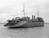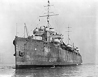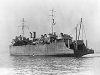 This stern view shows her mine rails and the short kingpost with its boom between them. The mine rails were portable and could be removed and stowed on board the ship when she was handling nets.
