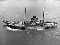 She had been fitted to carry a seaplane aft but here carries a landing craft instead.